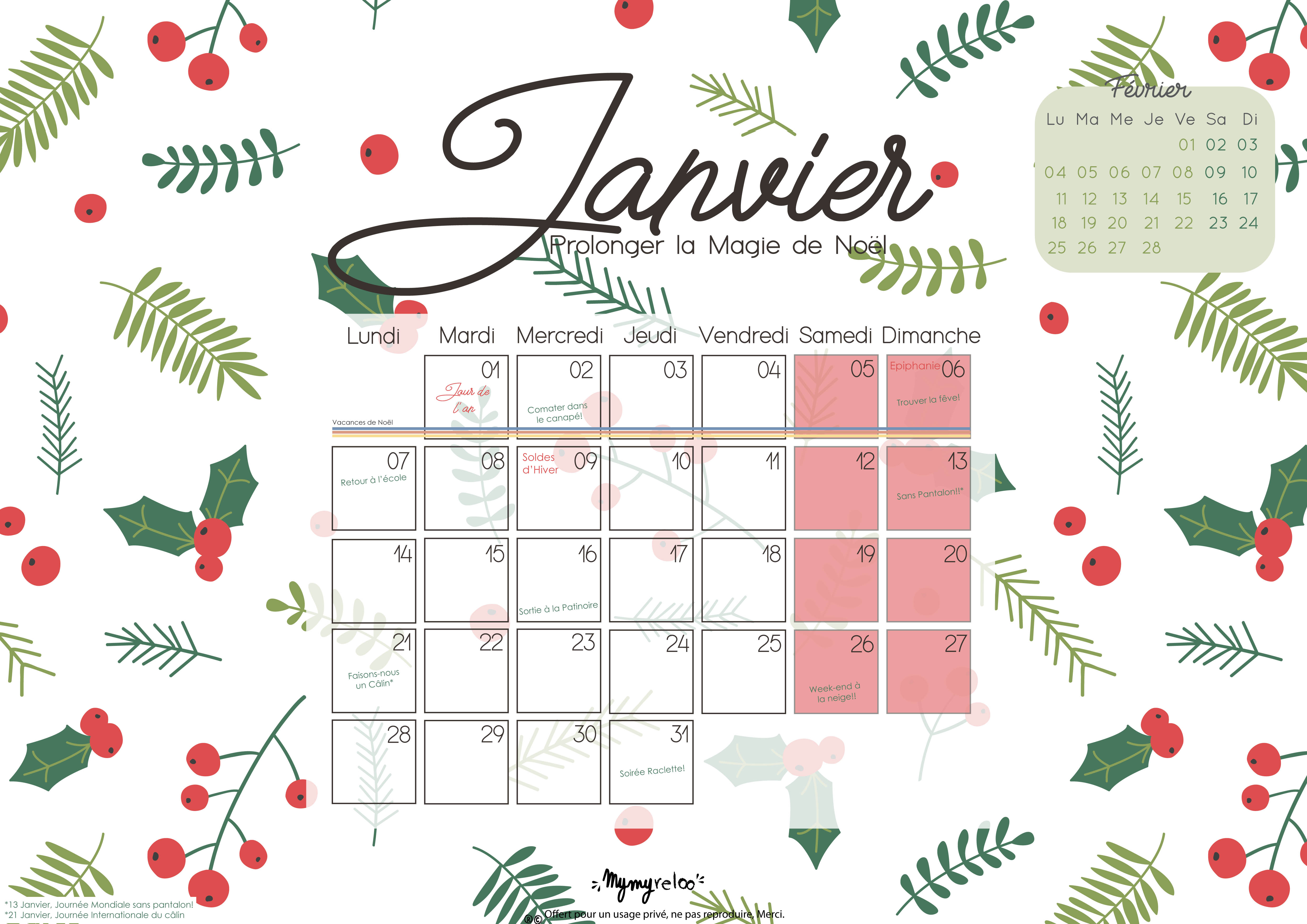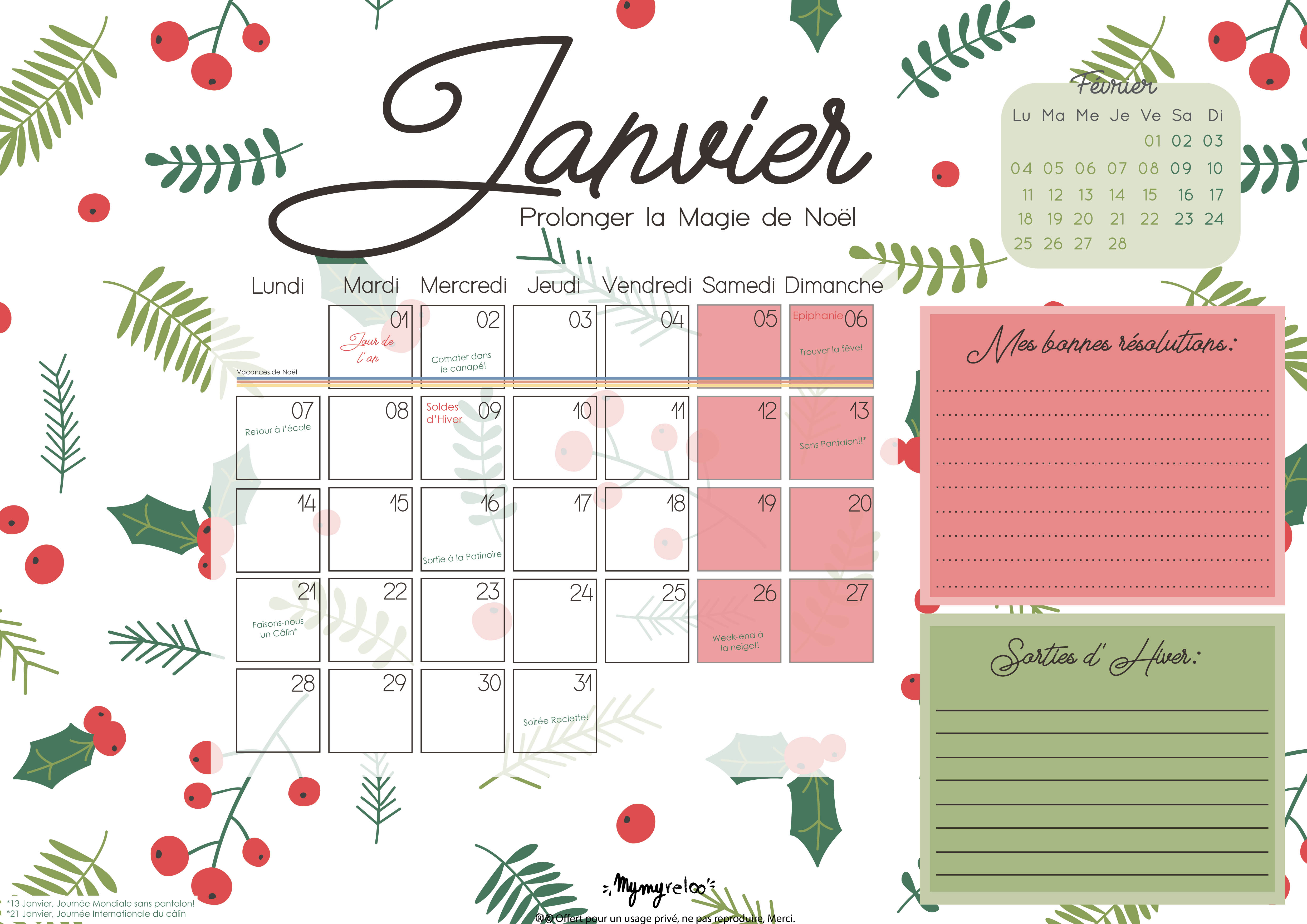 Pour ce 1er mois de l’année, j’ai voulu prolonger un peu cet esprit de Noël et de fêtes de fin d’année, je l’ai donc joué très « tradi » avec un imprimé « houx » dans les tons de rouge et verts! J’espère qu’il vous plaira!Voici donc le Printable: