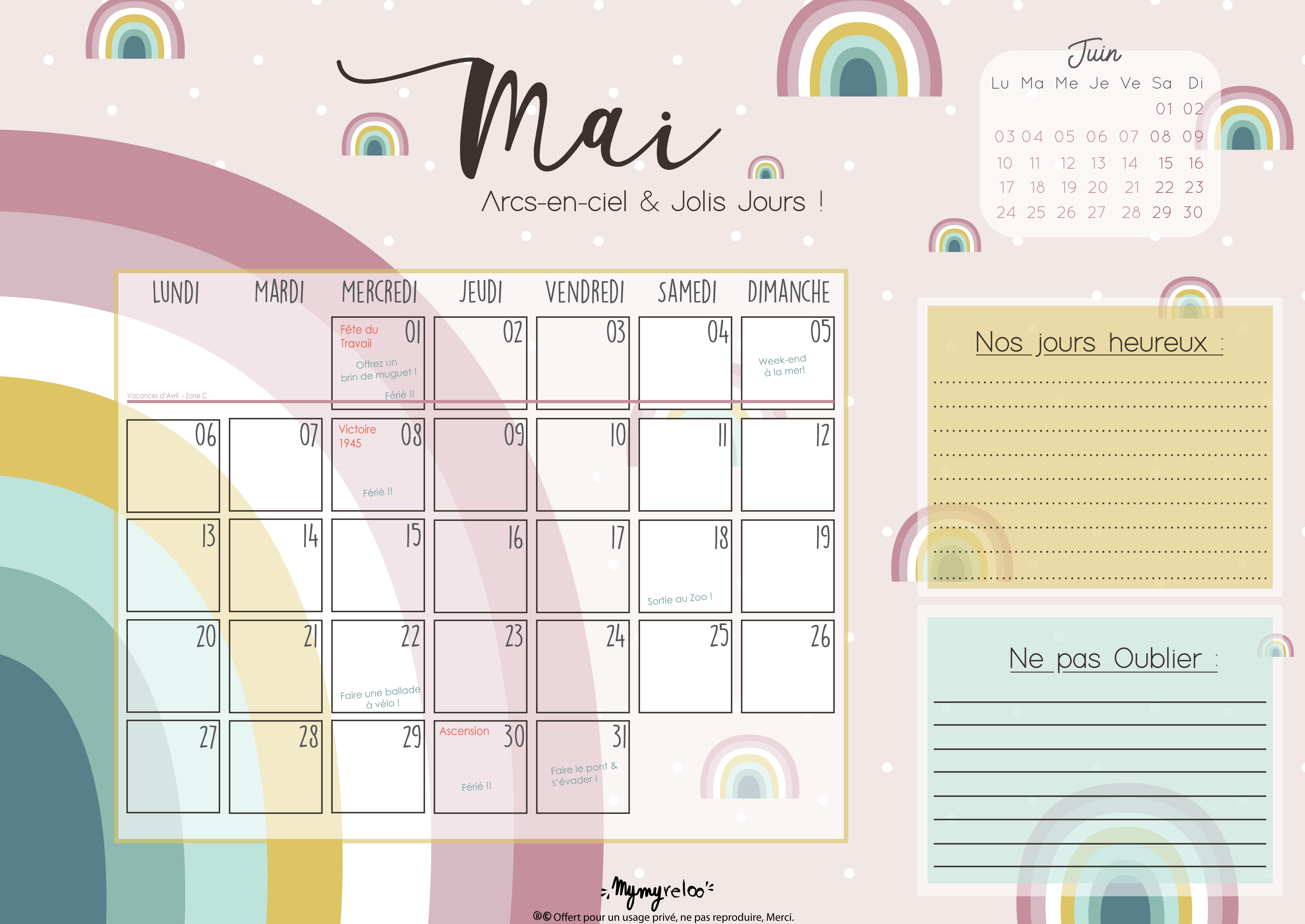 Mais passons au plus important: Vos goodies! Retrouvez donc un joli thème arc-en-ciel, car avec le mois de Mai: fini la pluie (on l’espère en tout cas!!) on voit arriver les prémices de l’été, et quoi de plus beau qu’un arc-en-ciel pour prédire le soleil et les belles activités à faire en plein air pendant les nombreux ponts?!