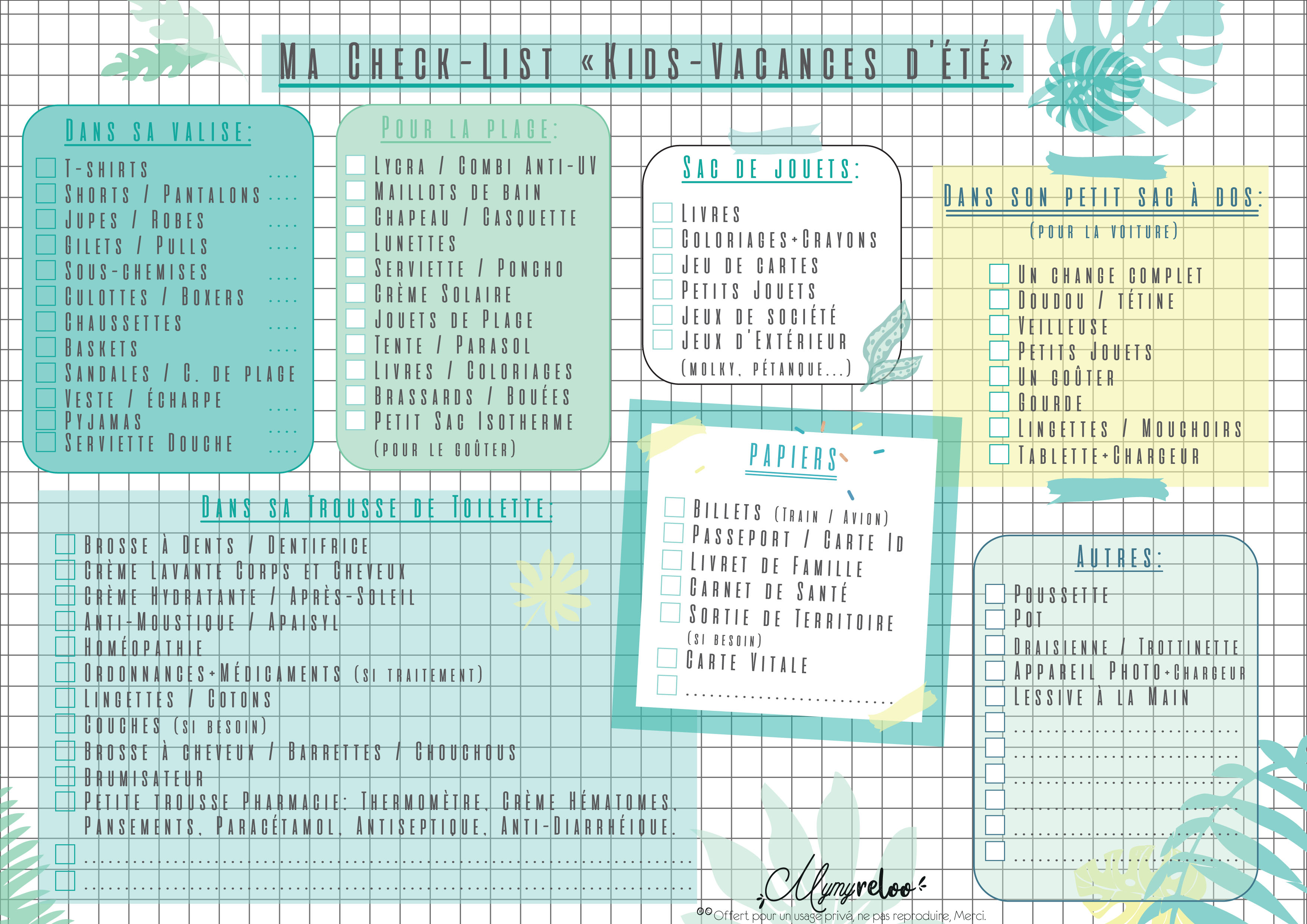 Alors, que vos enfants partent chez leurs grands-parents, en colonie de vacances ou bien que vous partiez tous ensemble en famille, j’ai pensé qu’une petite tcheck list spécial kids, spécial été, vous serait bien utile pour préparer les valises, façon maman organisée!!