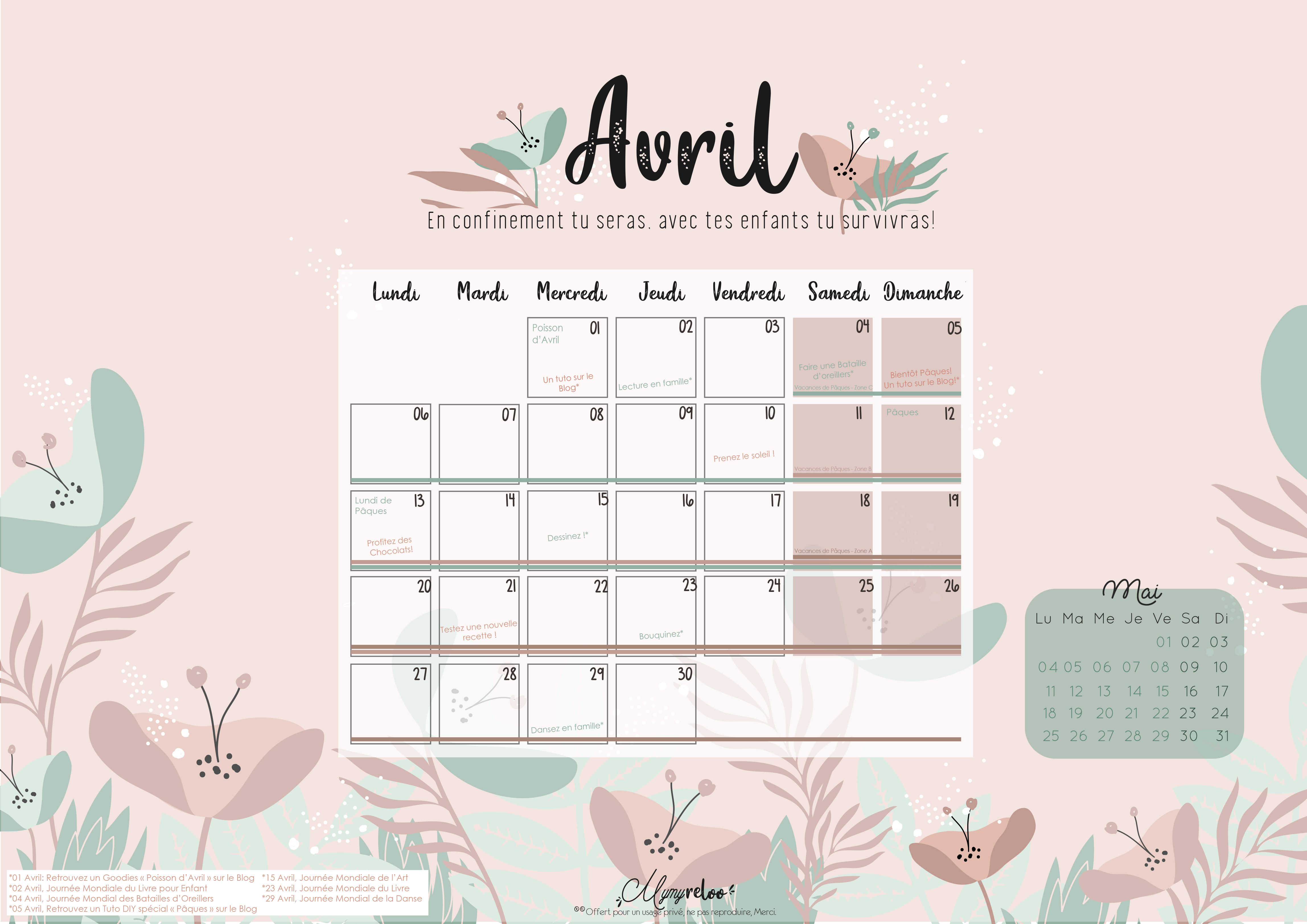 Les goodies du mois sont de retour ! Alors je sais que ce mois-ci sera différent, pour cause de confinement, je sais que ce n’est pas facile de rester à la maison avec les enfants, sans rien prévoir, ne pas cocher le super week-end prévu avec les copains, les fêtes…etc… Mais j’ai quand même voulu ne pas déroger à cette règle du calendrier, d’abord pour me faire du bien au moral, parce que dessiner, c’est ma thérapie, ma façon d’avoir le moral au soleil, mais aussi en me disant, que ça vous donnera aussi l’occasion de l’utiliser différemment. En prenant plus de temps pour les enfants, un peu pour soi aussi, en répartissant les tâches, en trouvant des idées d’occupations, bref, je suis sûr que vous saurez le remplir de pleins d’activités et de bonheur surtout !