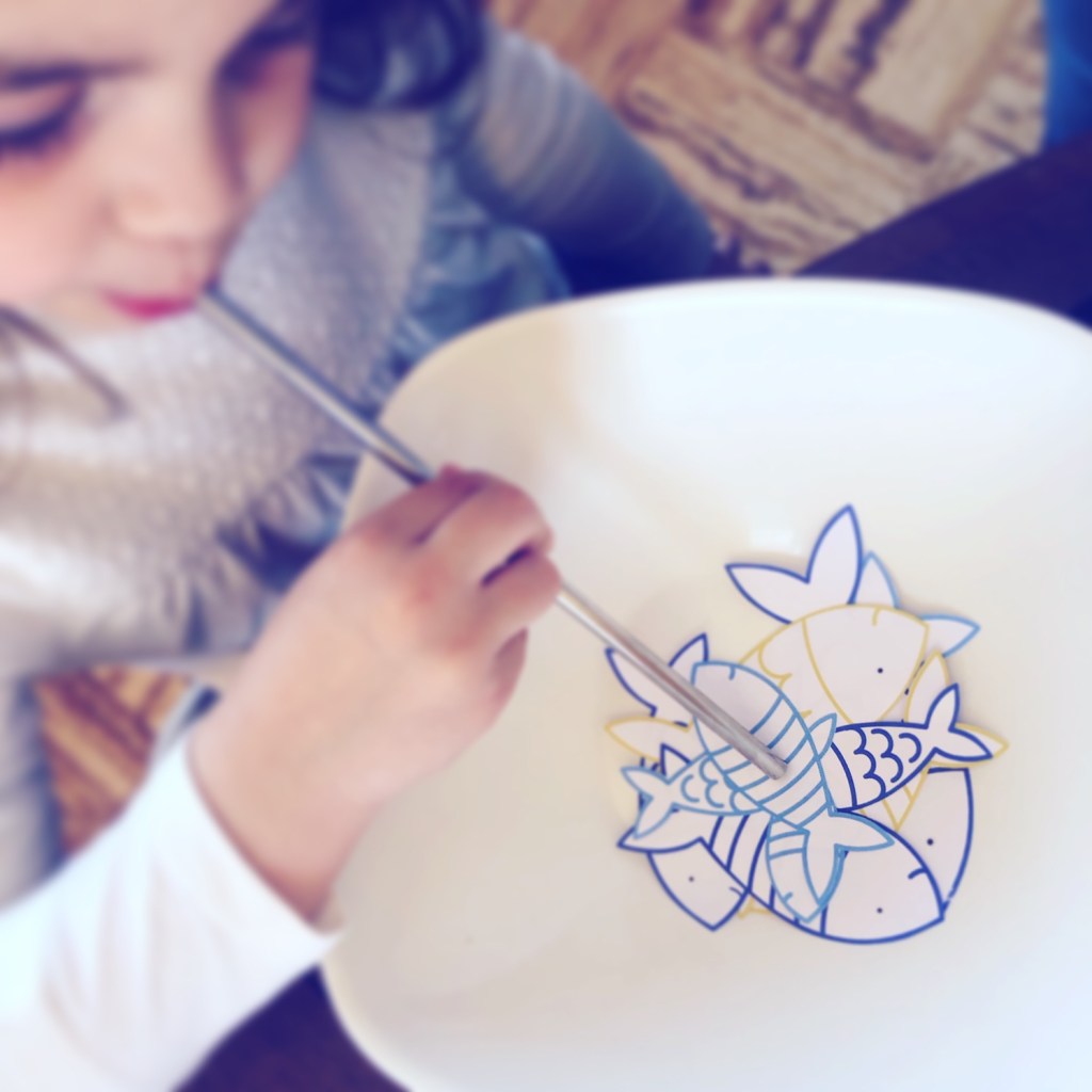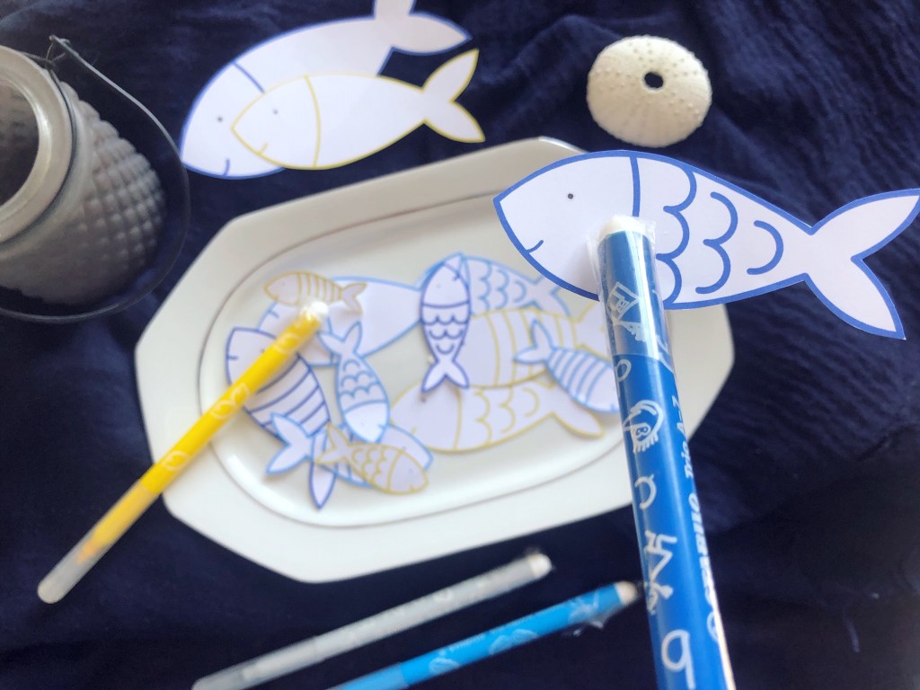 - Avec des petits bâtons, ou des crayons et un peu de scotch ou de Pâtafix. Fixez le scotch / la pâte sur l’extrémité du bâton ou du crayon, et ensuite essayez d’attraper les poissons dans une assiette. À chacun sa couleur ! Et voilà, facile et efficace !!