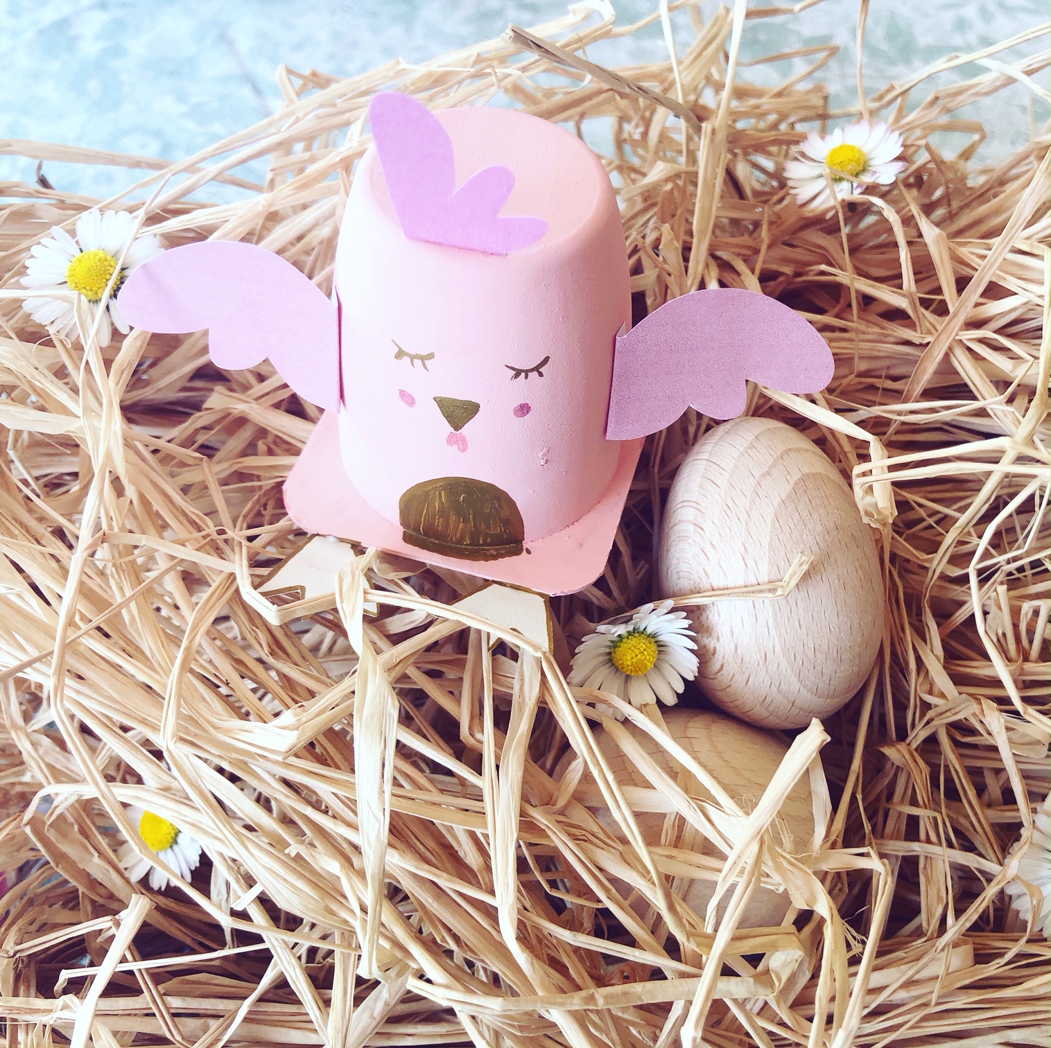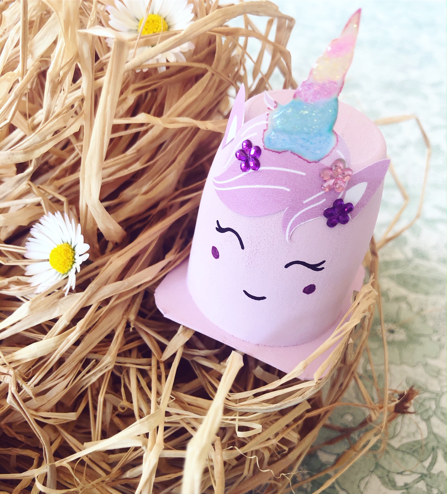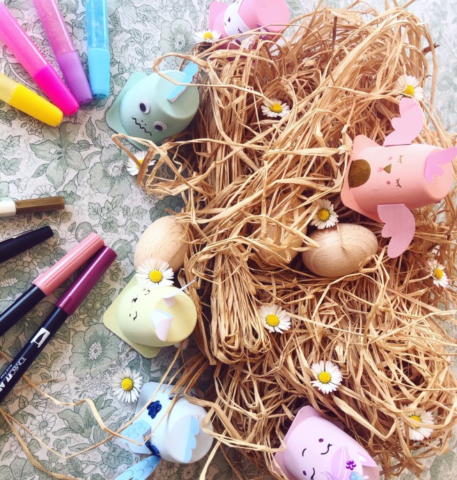 Pour finir, avec un feutre, dessinez les yeux, la bouche… Vous pouvez variez les couleurs de feutres, mais vous pouvez aussi utiliser un stylo dorés (pour la poule ici) ou de la colle à paillette (sur la corne de la licorne). Bref, c’est comme il veulent 😉