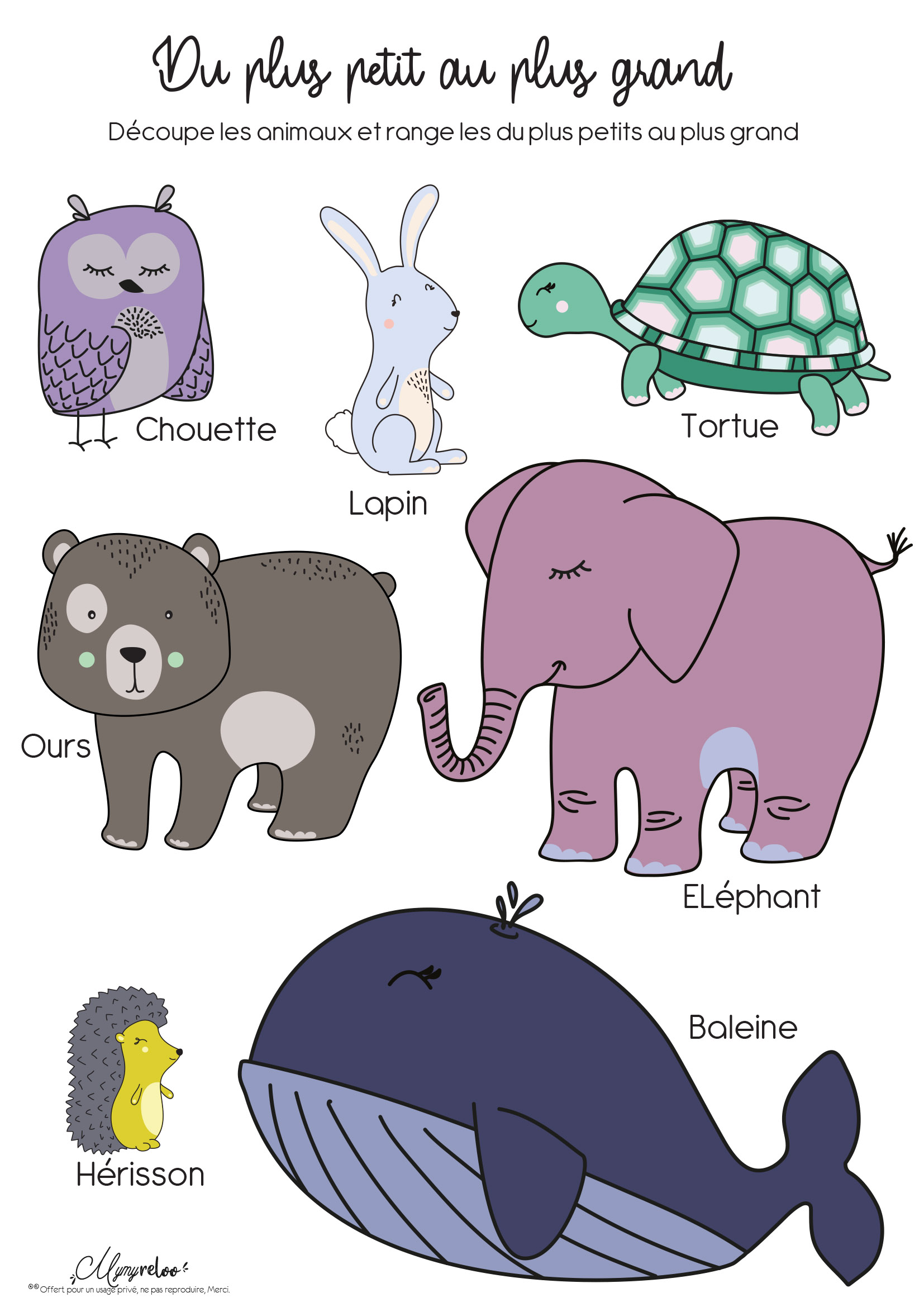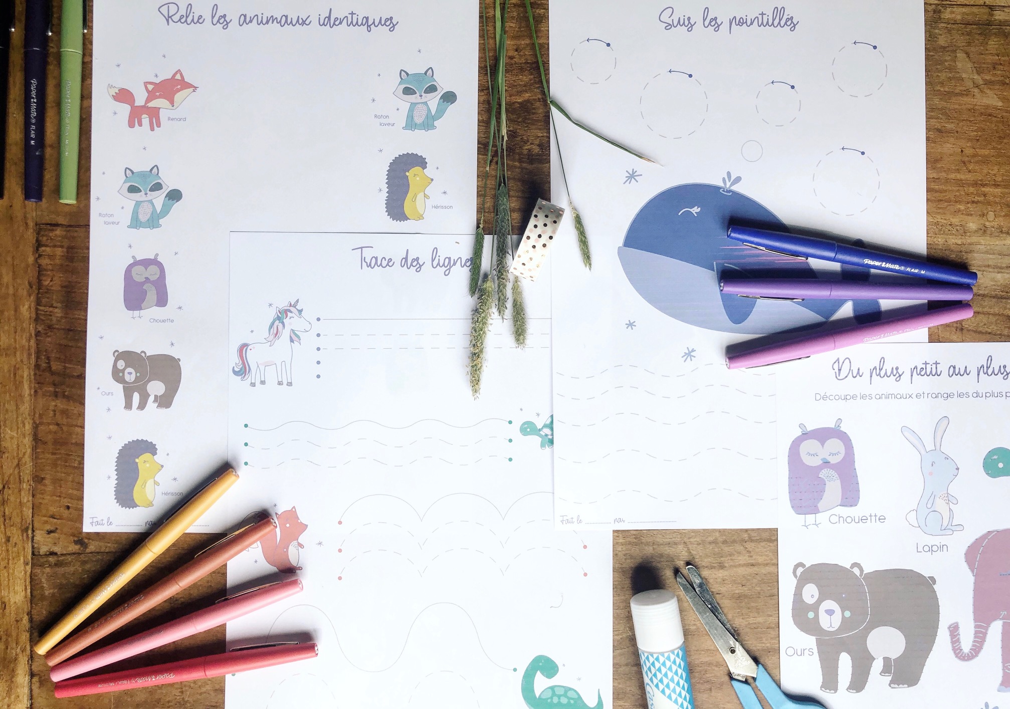 Vous trouverez une page d’identiques à relier, deux pages sur les différents tracés à suivre, pour faire des lignes, des vagues ou encore des ronds. Et une dernière page à découper pour placer dans l’ordre les animaux du plus petit au plus grand.