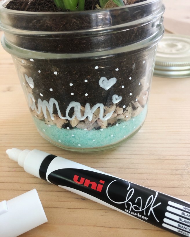 Ensuite, il suffit de décorer son pot. Ici, j’ai utilisé un feutre « craie » pour écrire « Maman » et faire quelques décorations simples. J’ai choisi ce feutre car, si l’envie m’en prend, je peux effacer le message/le dessin et le changer. Vous pouvez utiliser d’autres techniques ou surtout ce que vous avez sous la main. Un feutre à porcelaine ou à verre, ça marche aussi, mais c’est permanent, tout comme un feutre indélébile. Si vous utilisez l’une de ses 2 options, je préconise de commencer par la décoration du pot, pour que vos kids puissent mieux maintenir celui-ci et le laissez sécher.