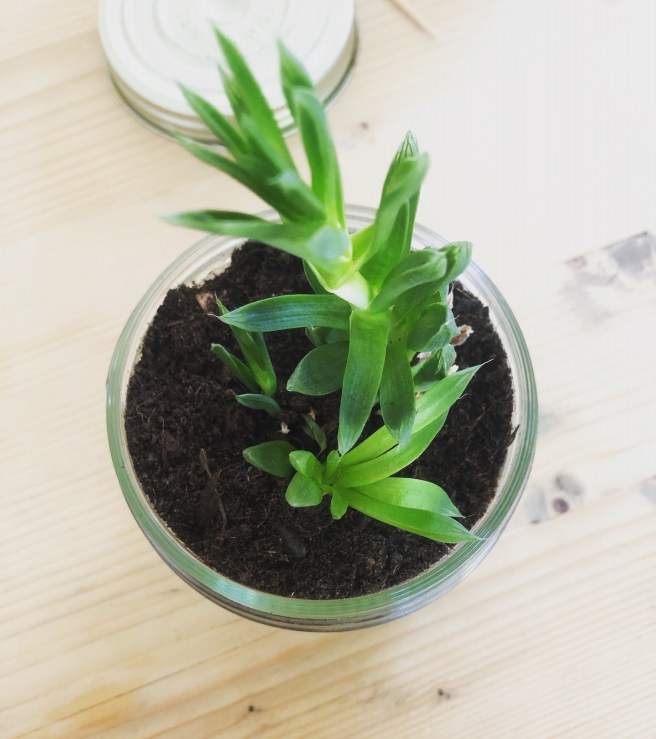 • Une petite plante vivace, une succulente ou encore un petit cactus, comme vous voulez, tant que celle-ci n’a pas trop besoin d’eau.