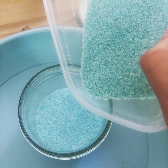 Astuce : Si vous souhaitez que votre sable soit coloré comme ici, c’est facile. Il suffit de prendre un feutre et de faire tourner la mine du feutre dans le sable jusqu’à ce qu’il se colore. Ça marche super bien ! (par contre, votre feutre est foutu, je préfère prévenir!)