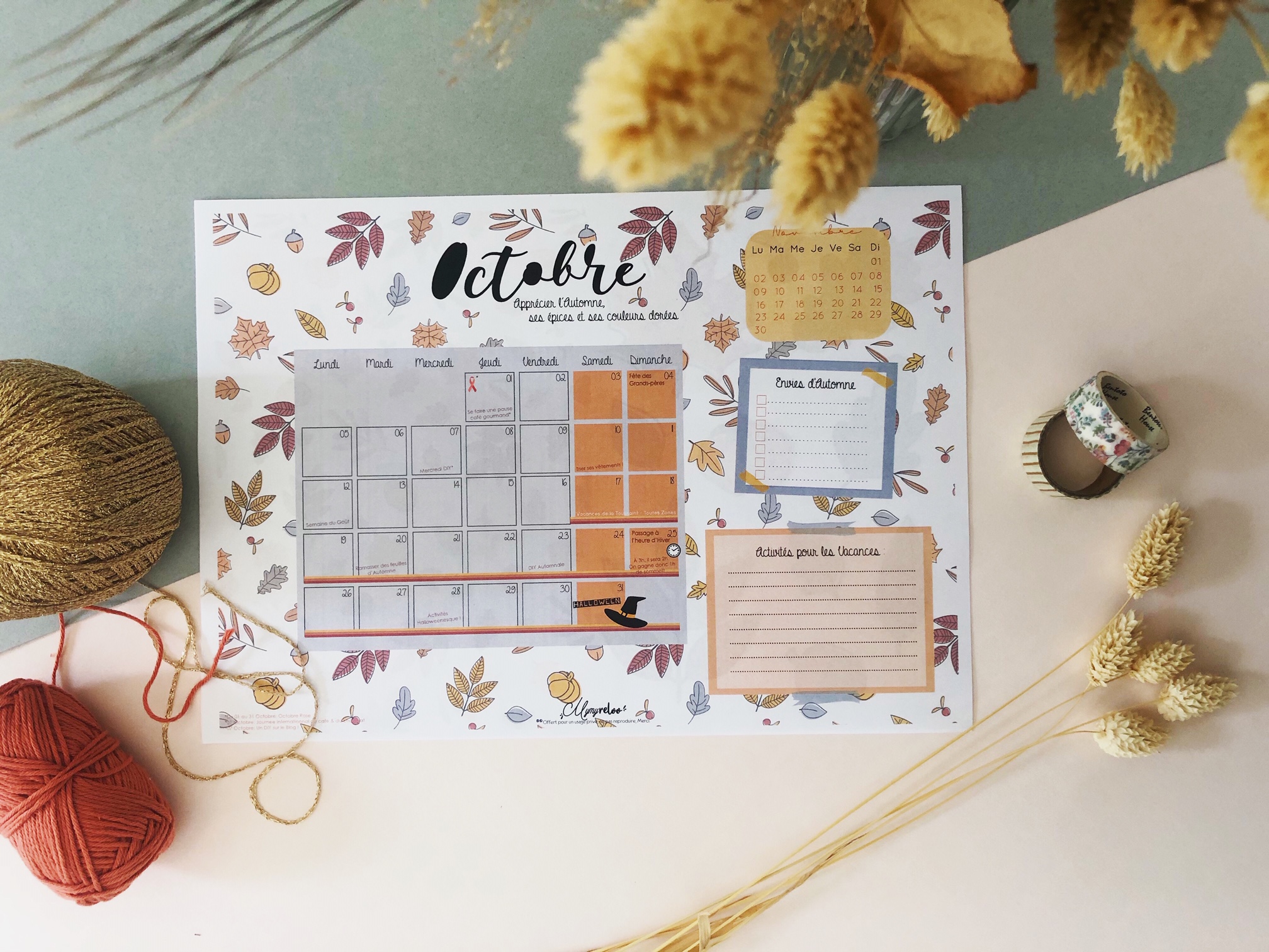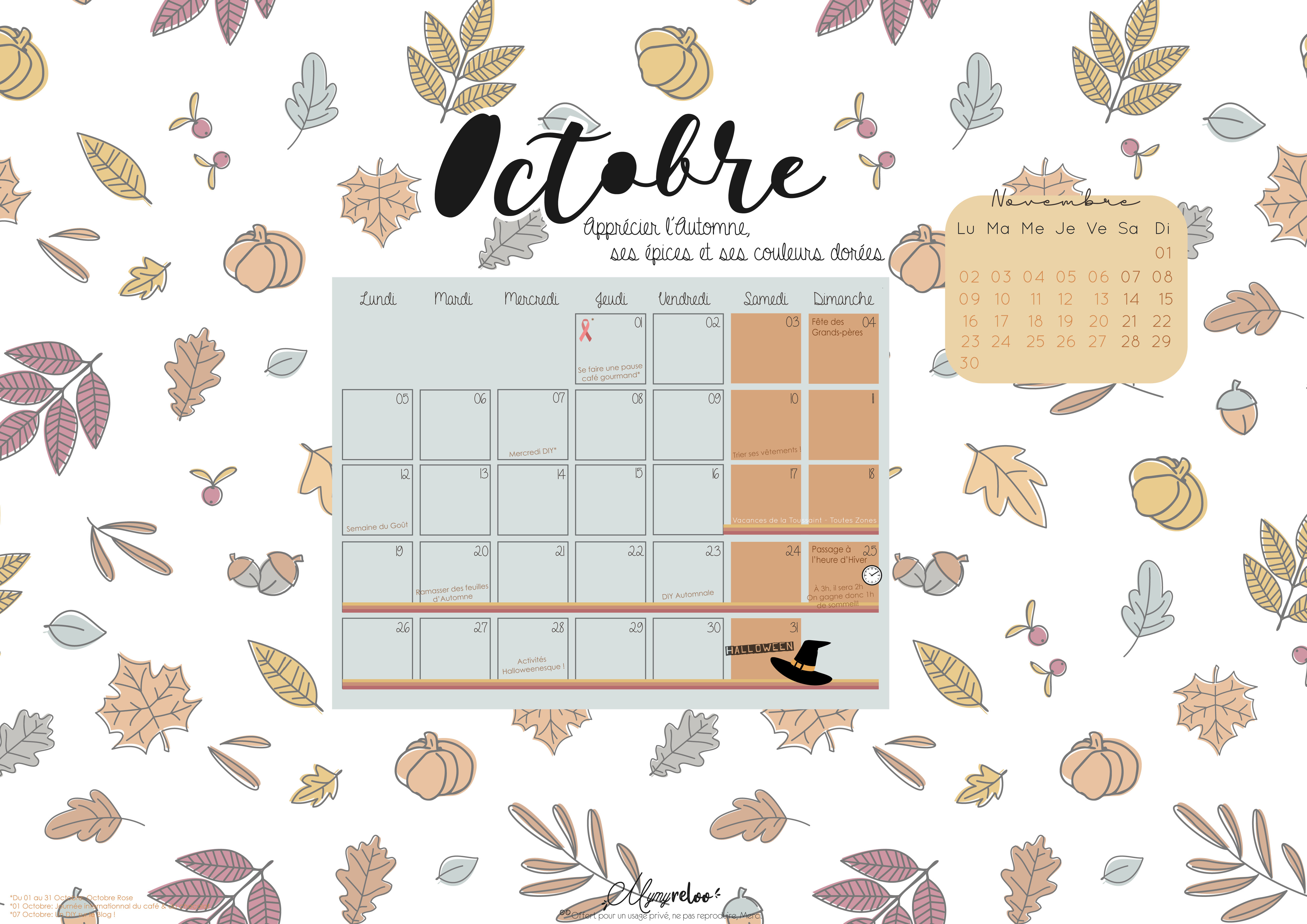 Voici donc votre mois d’Octobre. Ca faisait très longtemps que je n’avais pas joué la carte de l’automne avec des illustrations de feuilles & avec les couleurs chaudes de cette période que j’aime beaucoup, j’avais donc envie d’y revenir ! J’espère que vous apprécierez cette simplicité, qui colle très bien aux tendances terracotta du moment. 😉