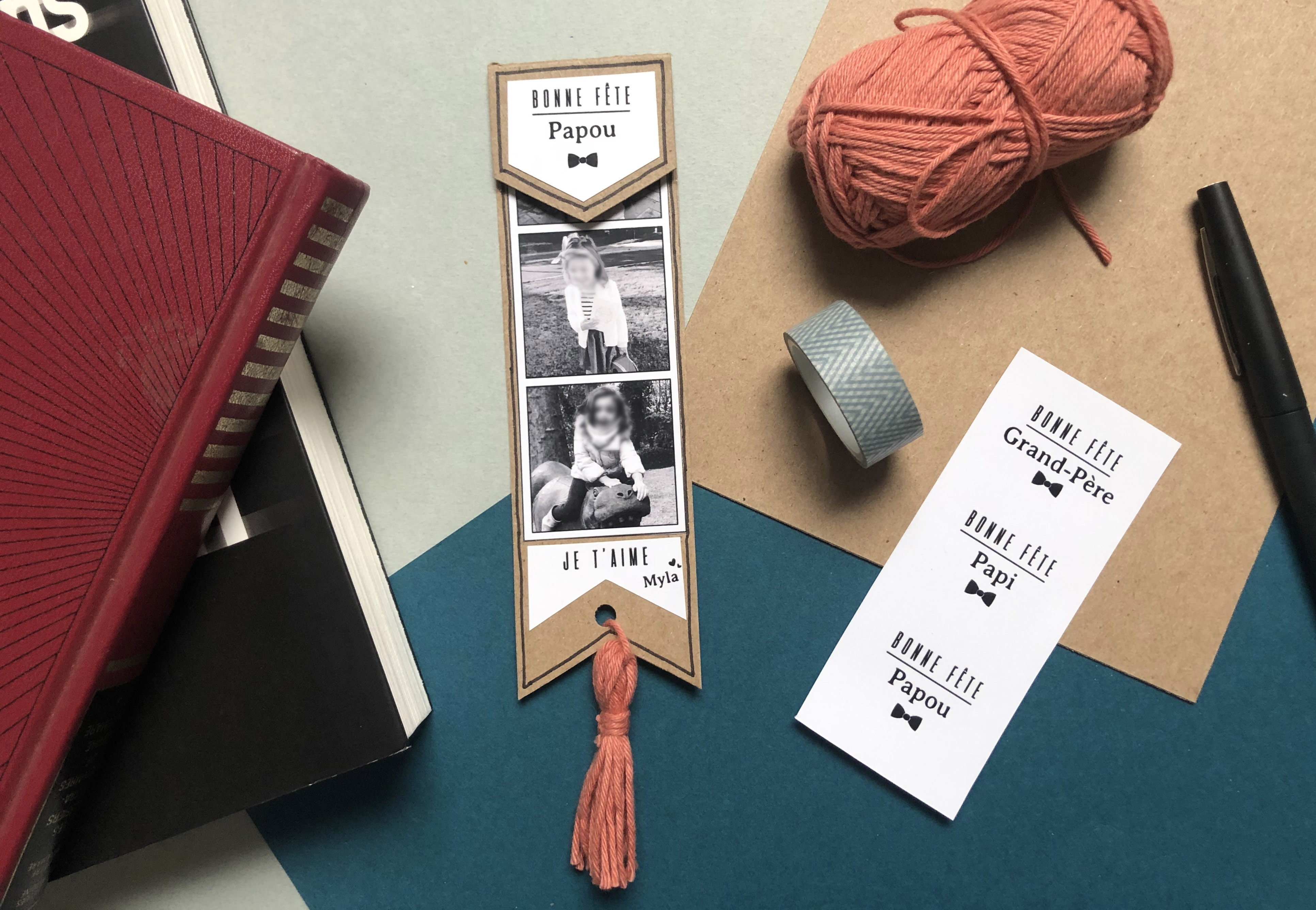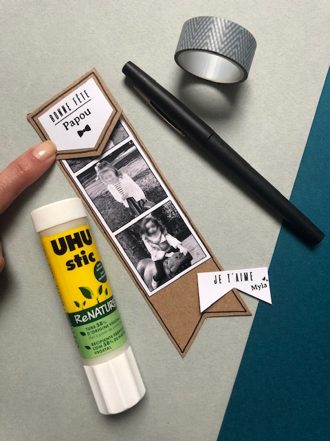 Ensuite, choisissez le petit mot que vous souhaitez placer sur le rabat et en dessous des photos, découpez-les et collez-les. Voilà, votre marque-page est prêt.