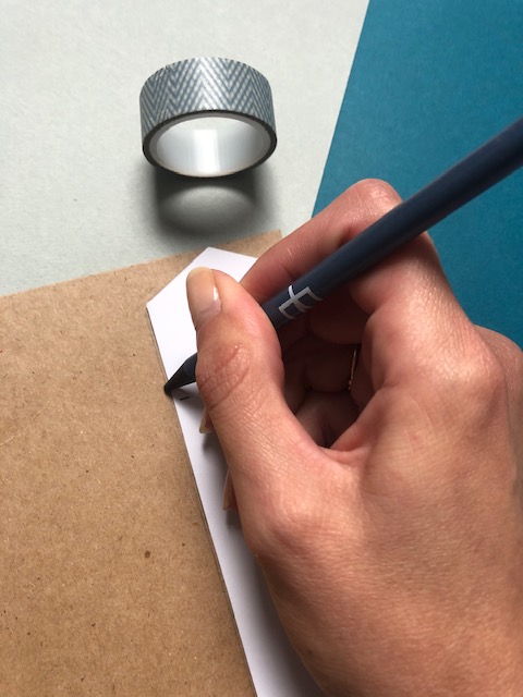 Reportez votre gabarit de marque-page sur un joli papier un peu épais (ici en Kraft). Vous pouvez aussi utiliser une feuille épaisse blanche à customiser par vos kids, avec des tampons ou de la peinture par exemple.