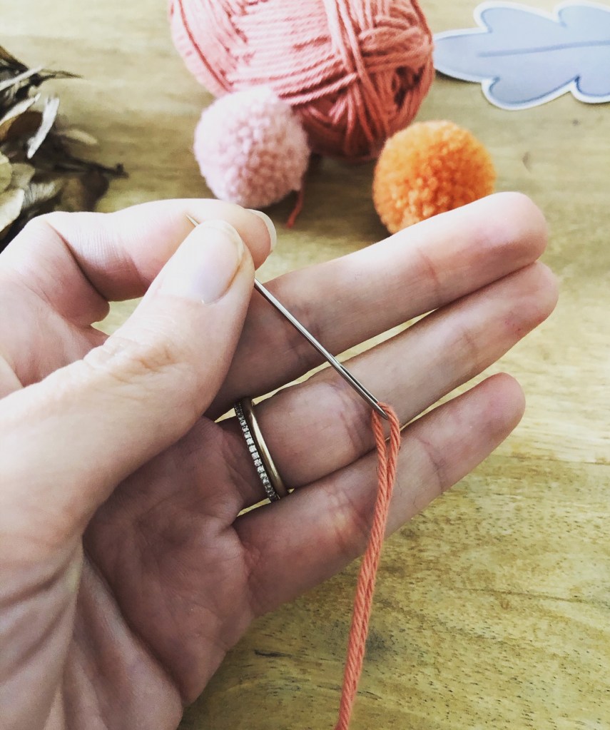 Ensuite, il faudra vous munir d’un fil (type petite pelote de laine ou ficelle type baker twine) et d’une grosse aiguille. Faites d’abord un nœud à une extrémité puis prenez un premier pompon, piquez-le en son milieu et enfilez-le.