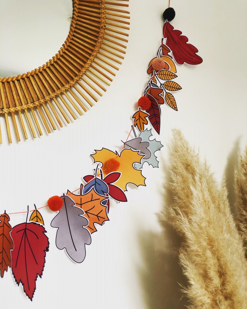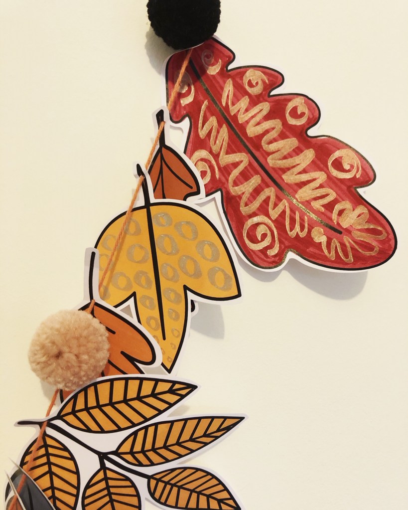 Et ensuite alternez selon vos envies les feuilles d’automne et pompons, en prenant soin de piquer les feuilles assez haut sur leurs tiges. Un dernier nœud à l’autre extrémité et hop, le tour est joué !