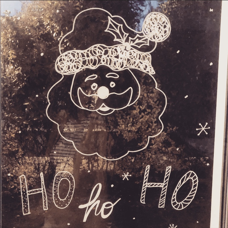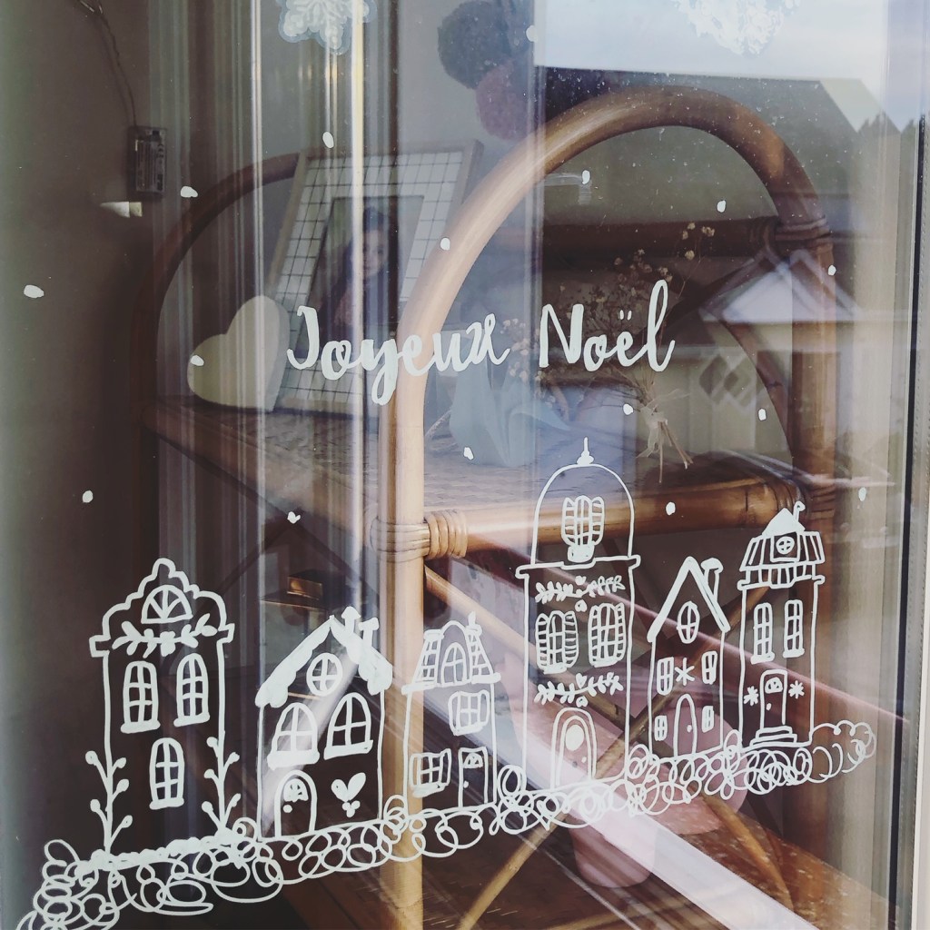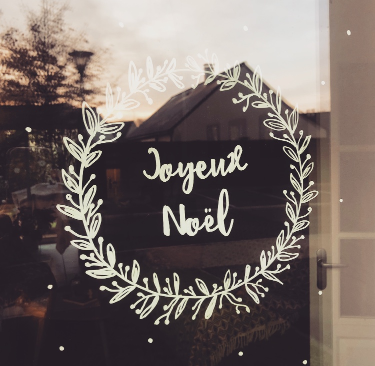 Pour vos dessins avec mots, à vous de choisir si vous souhaitez que les passants les lisent, ou si vous voulez les garder pour vous ! Par exemple, sur mes fenêtres côté rue : j’ai choisi de laisser les « Joyeux Noël » tournés vers l’extérieur, pour que mes voisins puissent en profiter, et sur les fenêtres côté jardin, c’est nous qui en profitons 😉