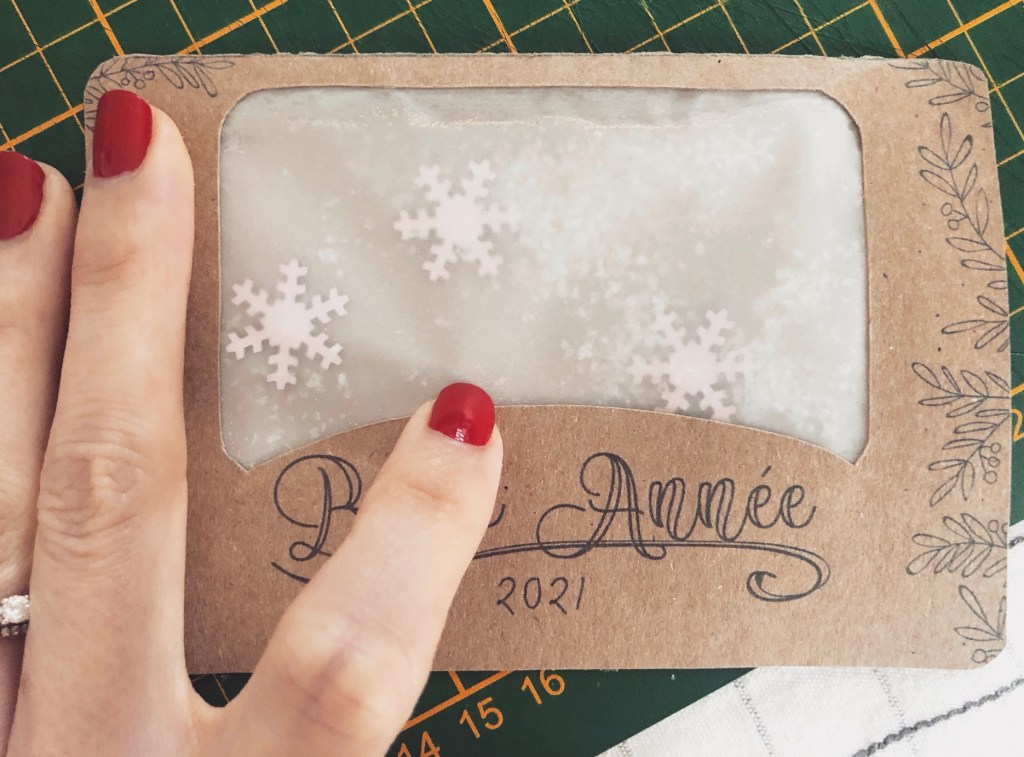 Ensuite, glissez entre les 2 épaisseurs quelques paillettes, fausse neige ou confettis et coller le bord restant pour qu’ils ne s’échappent pas. Et vous aurez un joli rendu « effet boule à neige, à secouer » sur votre carte ! 😉