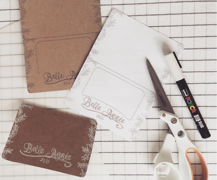 Pour celles qui préfèrent le vrai kraft, ou un autre fond, je vous invite à décalquer le dessin pour le dessiner à la main, c’est ce que j’ai fait sur une des versions.