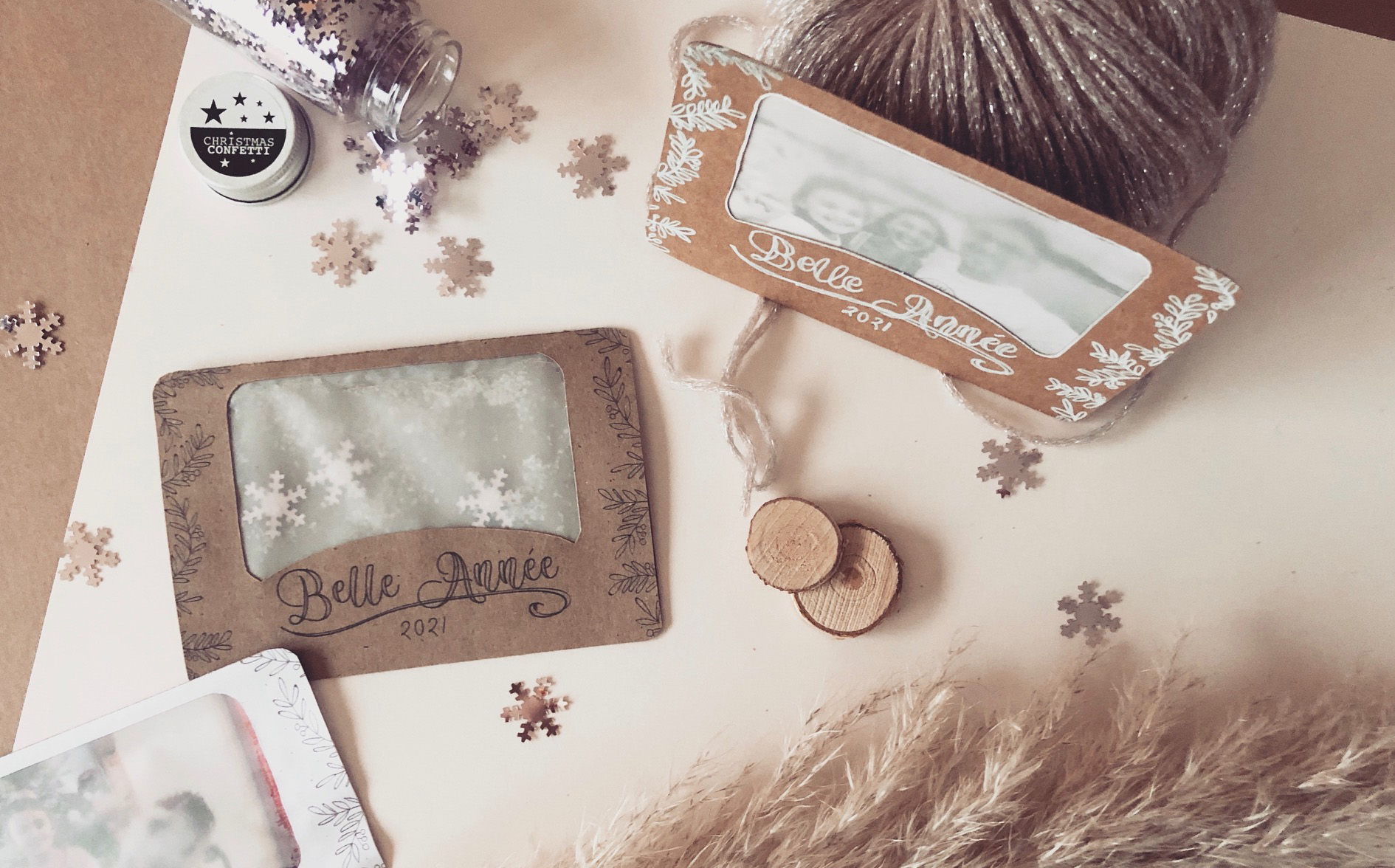Si vous ne voulez pas y mettre de photo, aucun problème, vous pouvez y coller une autre image ou faire comme ici : une fenêtre avec quelques paillettes & flocons. Pour cela, il suffit de recoller une 2ème épaisseur de papier calque, en laissant un côté non collé.