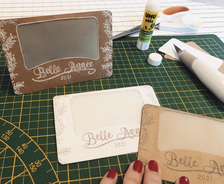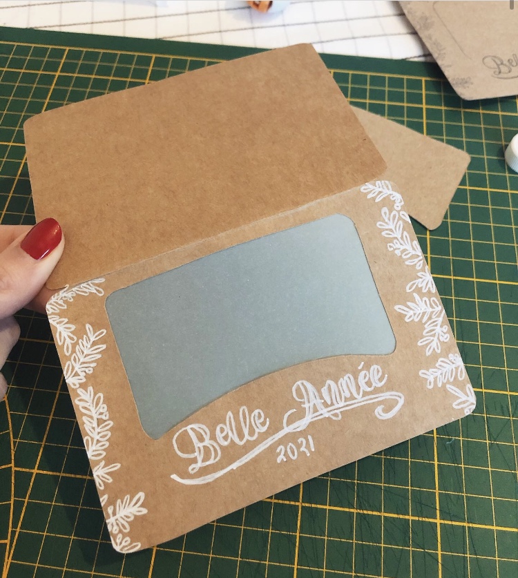Découpez les contours des cartes ainsi que l’espace prévu pour la photo (avec un cutter). Découpez un rectangle dans du papier calque ou du couvre livre, plus transparent, un peu plus grand que la fenêtre « photo » et collez-le au dos sur les rebords puis rajoutez votre photo, pour qu’elle apparaisse côté extérieur.