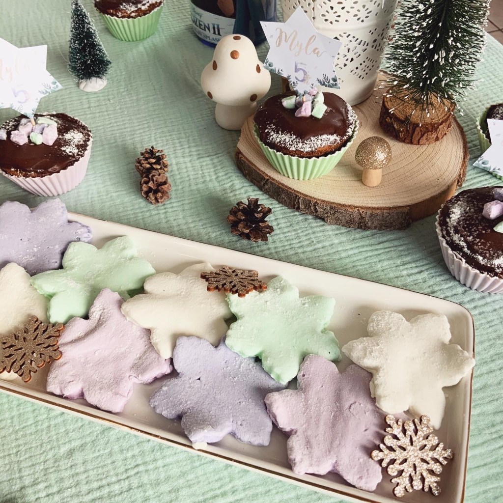 Côté gourmandises, j’ai opté pour les flocons, sous différentes formes. J’ai fait des guimauves maison en forme de flocon, facile à faire, mais un peu moins à démouler ! 🙂 Mais tellement bonnes ! Et pour le gâteau, j’ai trouvé un moule parfait chez Zodio 🙂 J’ai fait le gâteau que Myla préfère : un moelleux choco-lait, avec glaçage tout choco, une valeur sûre pour des enfants ! Un peu de sucre glace par-dessus, et le tour était joué. 😉 J’ai décliné la même recette sur des petits cupcakes avec des petits morceaux de chamallow qu’il me restait #anti-gaspi.