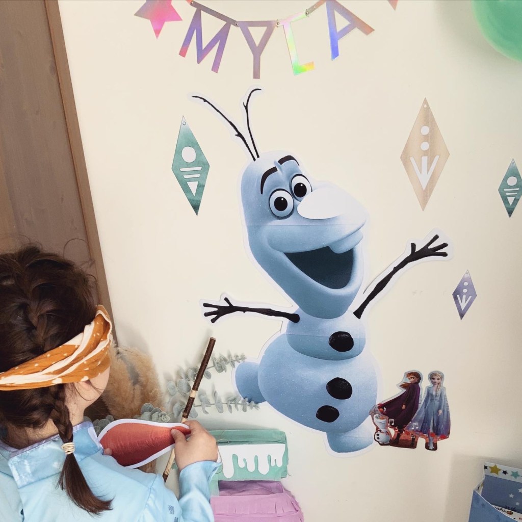 Ensuite, j’ai aussi préparé un Olaf géant ! Non seulement, il était parfait pour la déco, mais en plus, il faisait office de jeu de la « queue de l’âne ». Les filles ont beaucoup aimé le principe de se bander les yeux pour replacer le nez carotte d’Olaf au bon endroit ! Elles ont bien rigolé et l’ont fait plusieurs fois 🙂