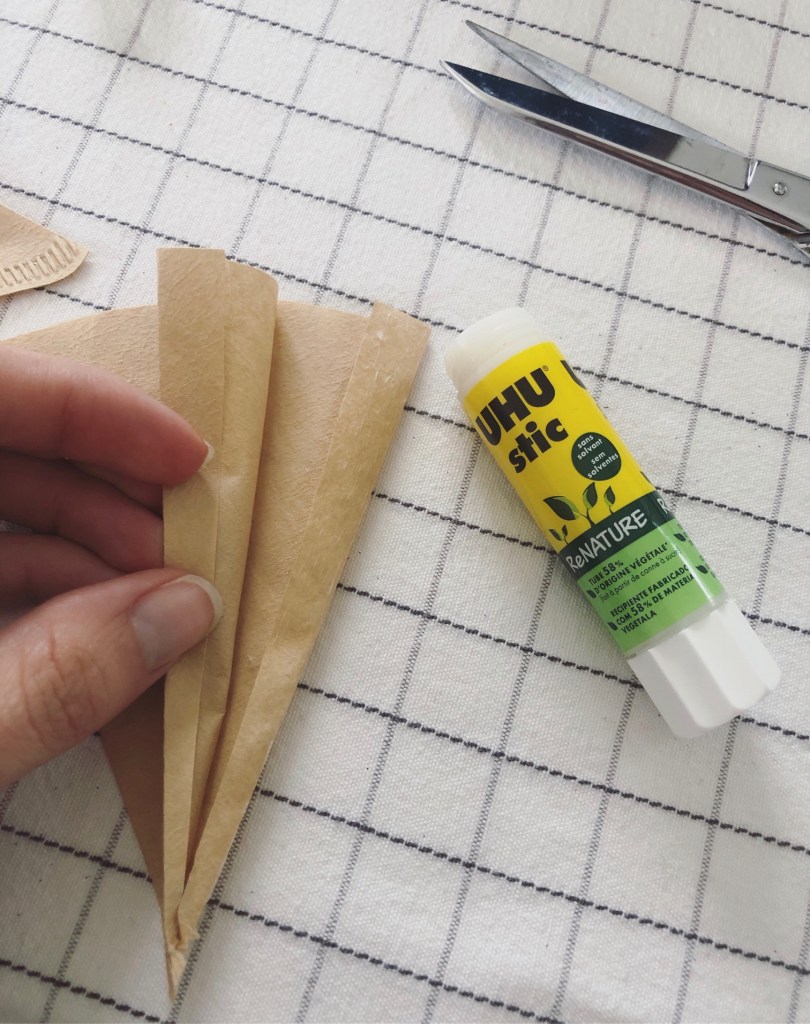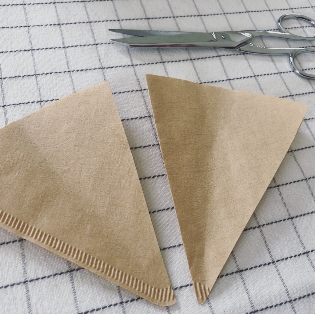 Prenez donc un filtre à café, et pliez-le en 2. Une fois cette démarcation faite, coupez en triangle, de sorte de faire 2 carottes sur chaque filtre. Repliez bord à bord pour arrondir au ciseaux le haut de votre carotte. Puis pliez les rebords longs et collez-les. Voilà, vos contenants sont prêts. Simple, non ?