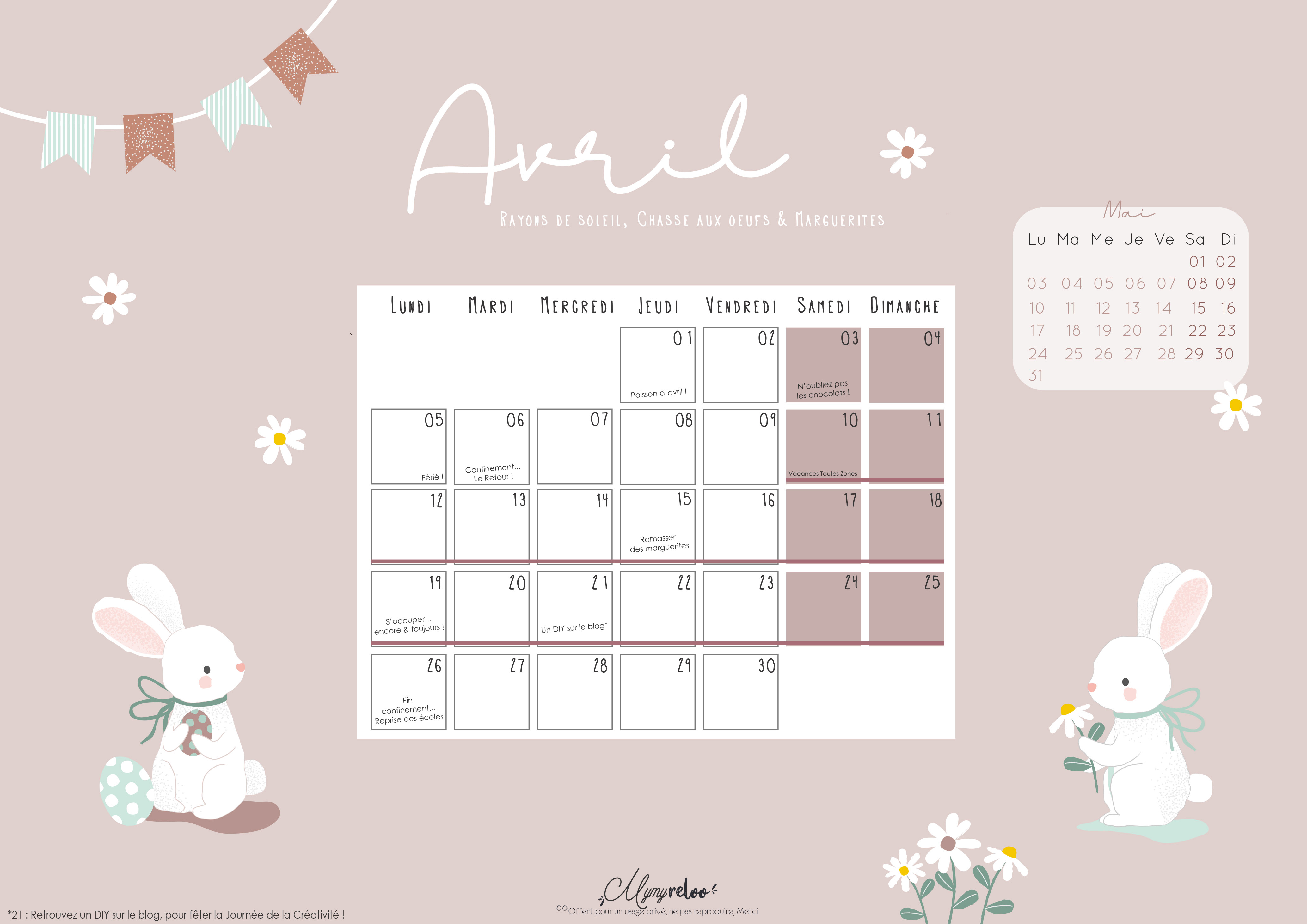 Vous trouverez donc : Le Printable : parfait pour voir le mois complet, en détail, à imprimer et poser sur le frigo ! 🙂