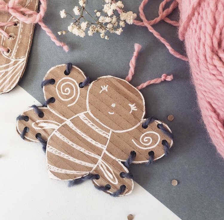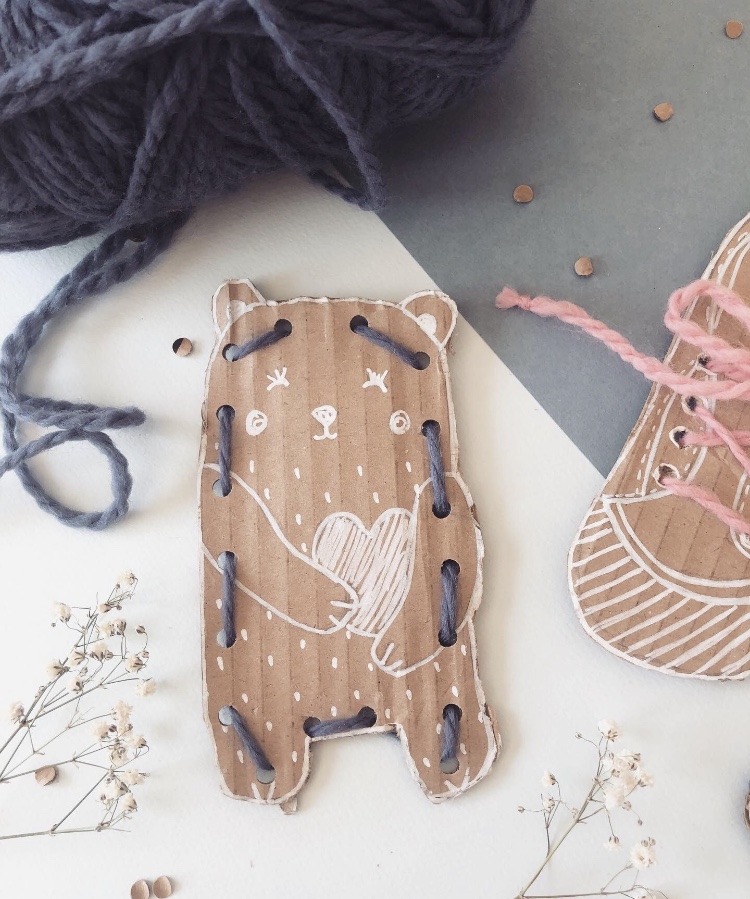 Il ne vous restera plus qu’à enfiler votre ficelle dans le 1er trou et faire un nœud au dos du carton, puis laissez vos kids lacer la ficelle : dessus puis dessous, ou bien en point de feston ou avec d’autres points plus élaborés pour les plus grands !