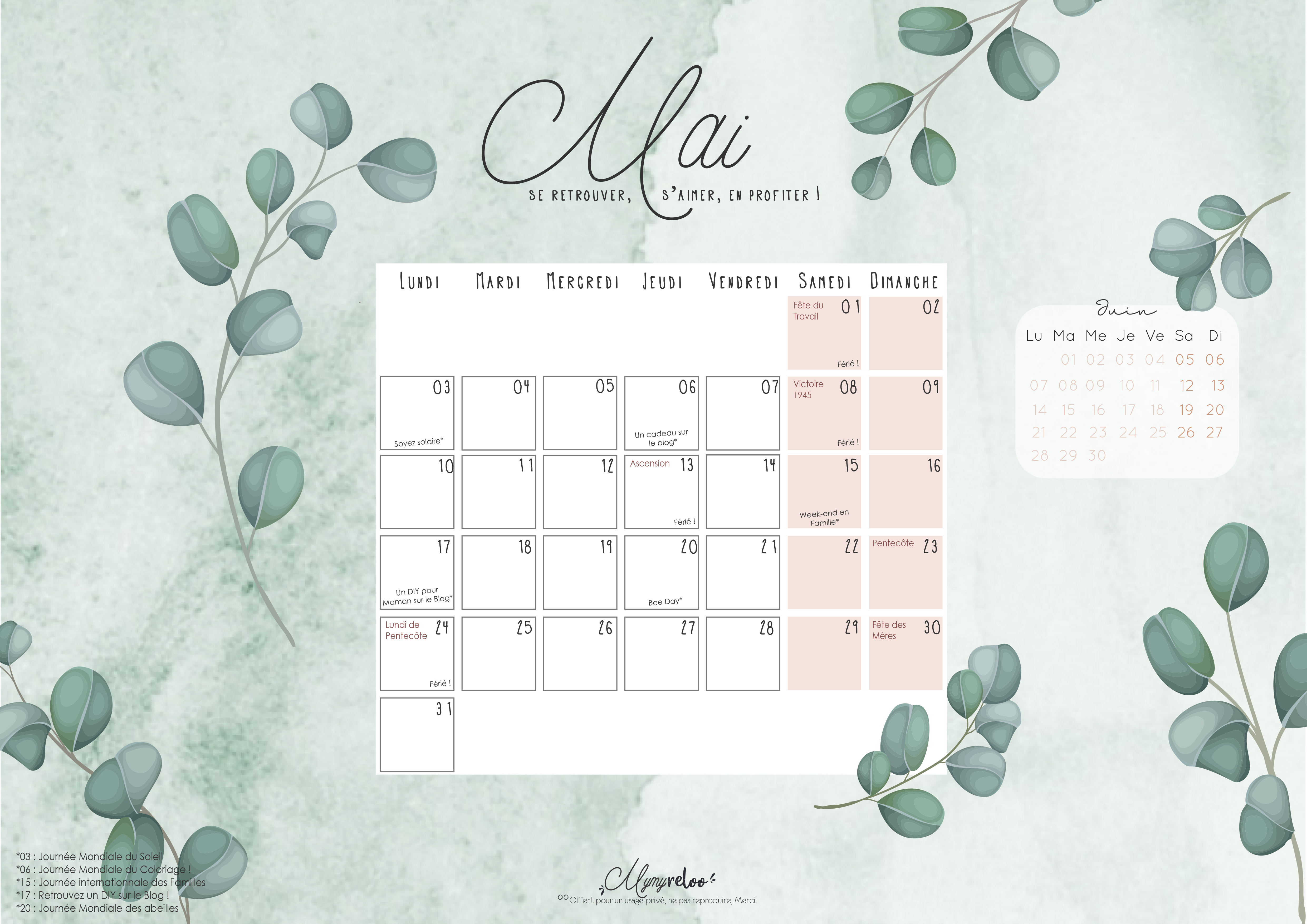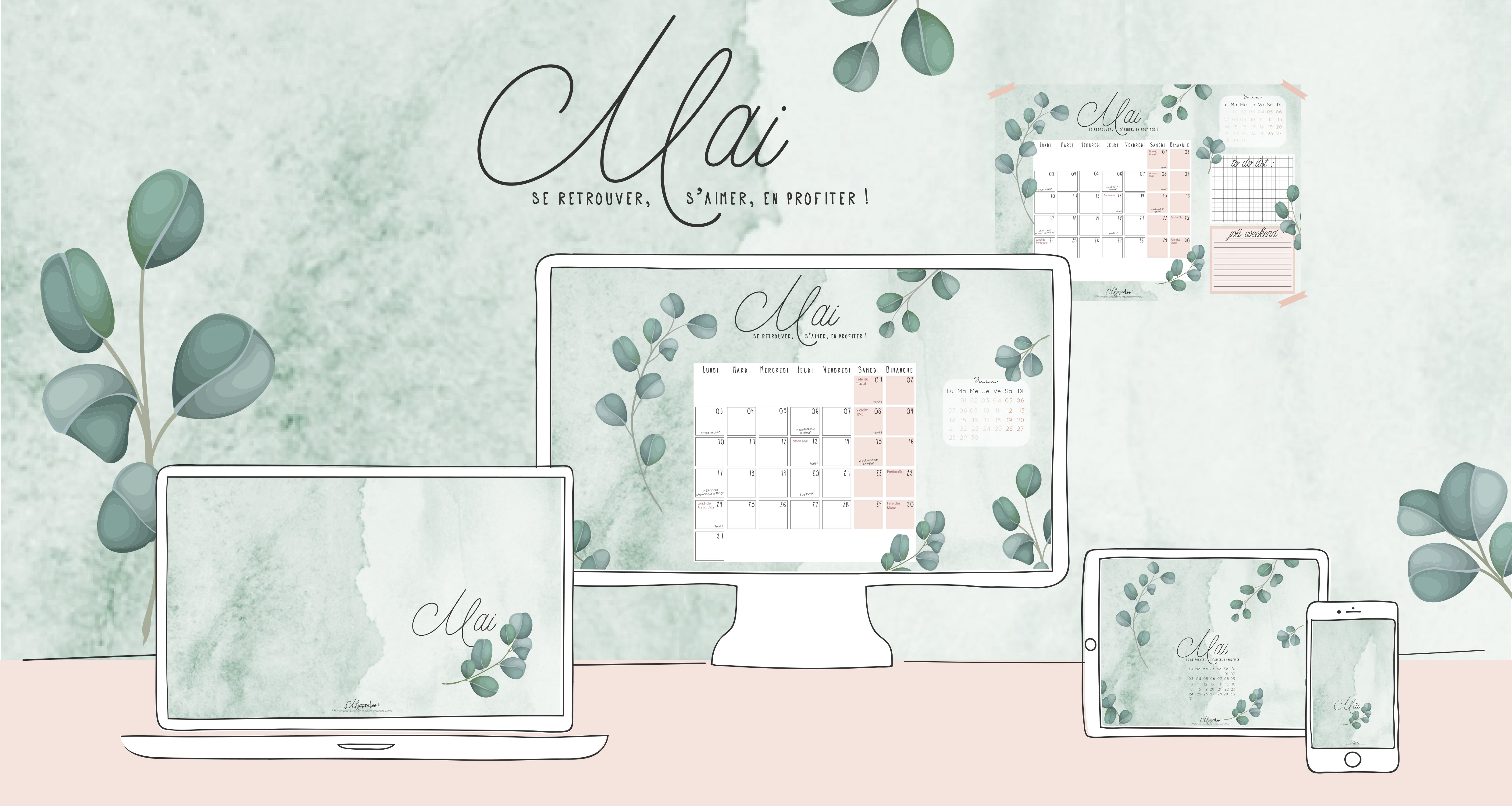 Voici donc un nouveau lot de goodies pour votre mois de Mai 2021, sous le signe de l’eucalyptus, un thème frais et fleuri. J’espère que vous pourrez utiliser ce nouveau calendrier pour enfin revoir vos proches, faire un ou 2 restos même, bref vivre ce joli mois de mai comme il se doit ! Même si les ponts se font rares cette année 😉