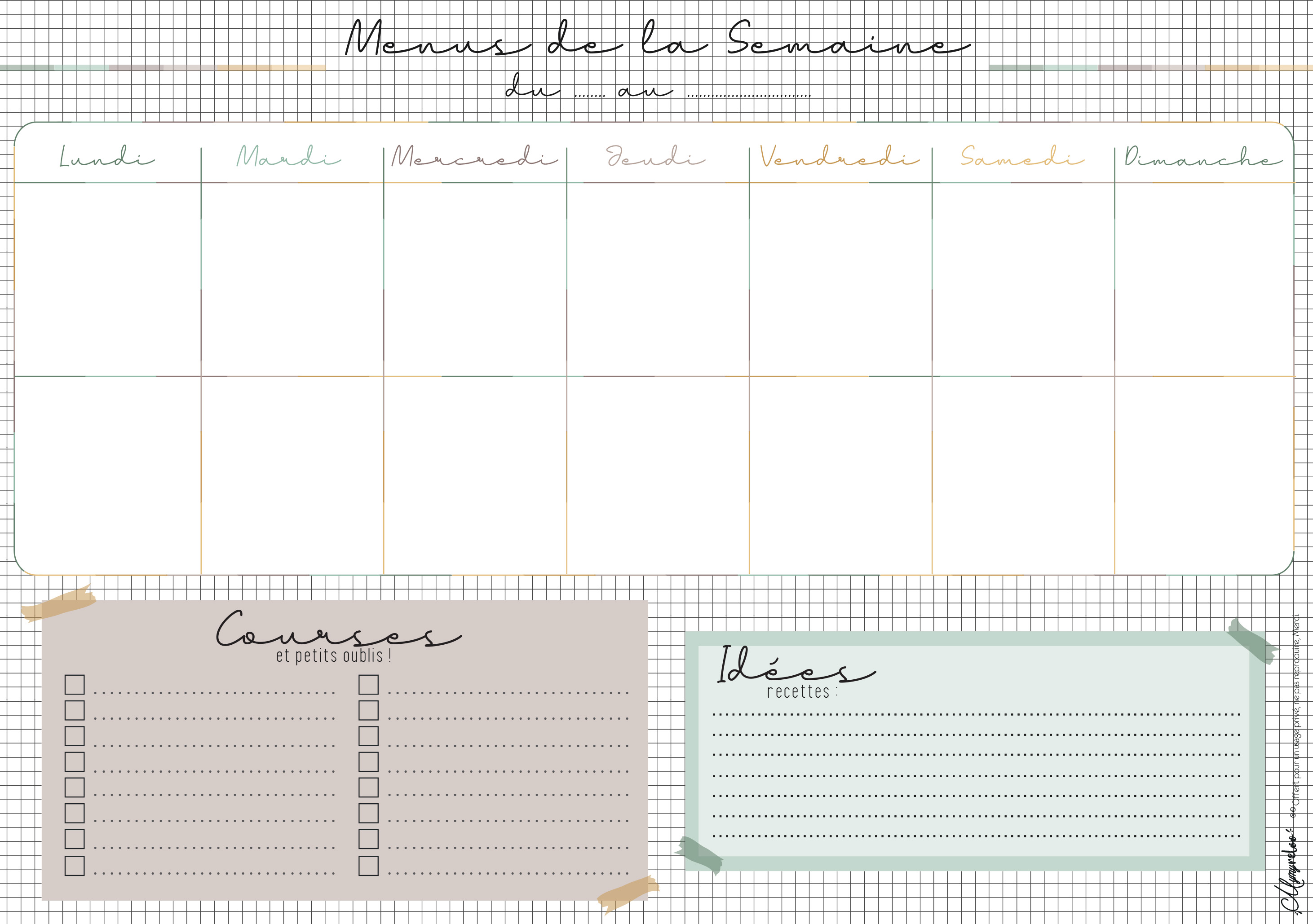 Pour les mamans les plus organisées, il y a aussi le tableau des Menus, pour organiser les dîners de la semaine, et faire les courses en conséquences.