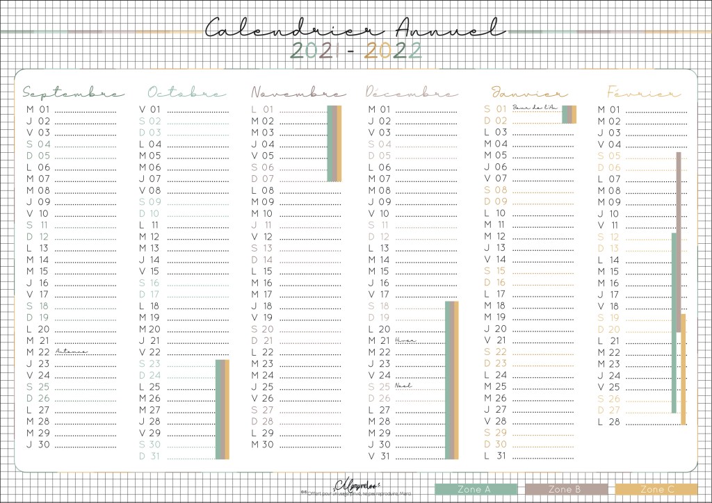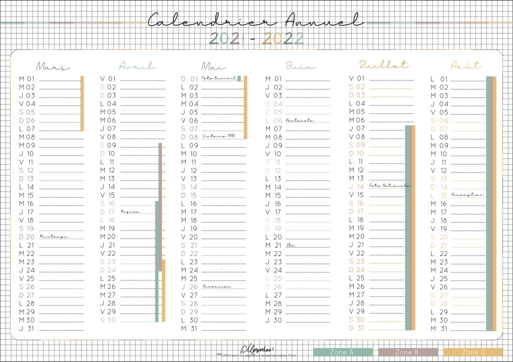 Voici donc les calendriers « annuel » et « semestriel », qui vous permettront de voir sur le long terme, avec les vacances scolaires et jours fériés. (De quoi déjà préparer une petite escapade :)) Pour celui-ci, suivez le lien ici 😉