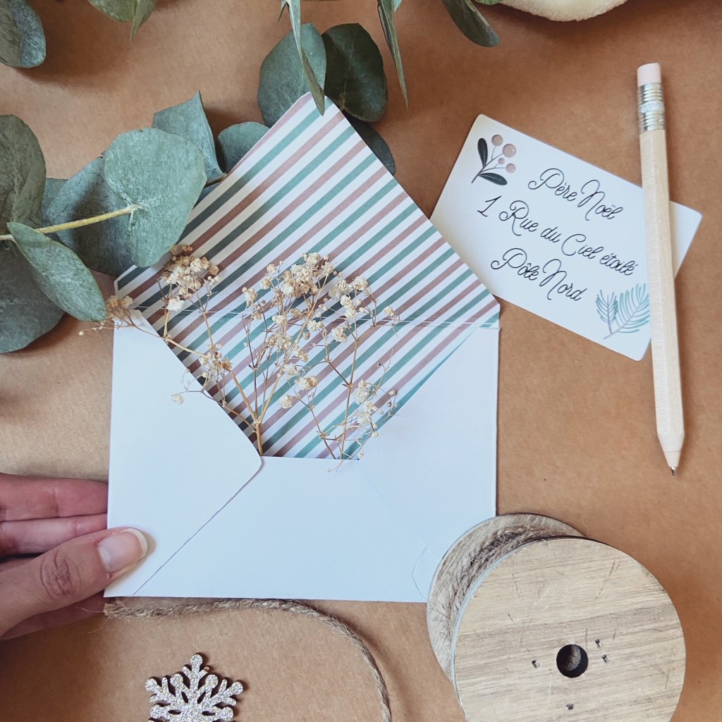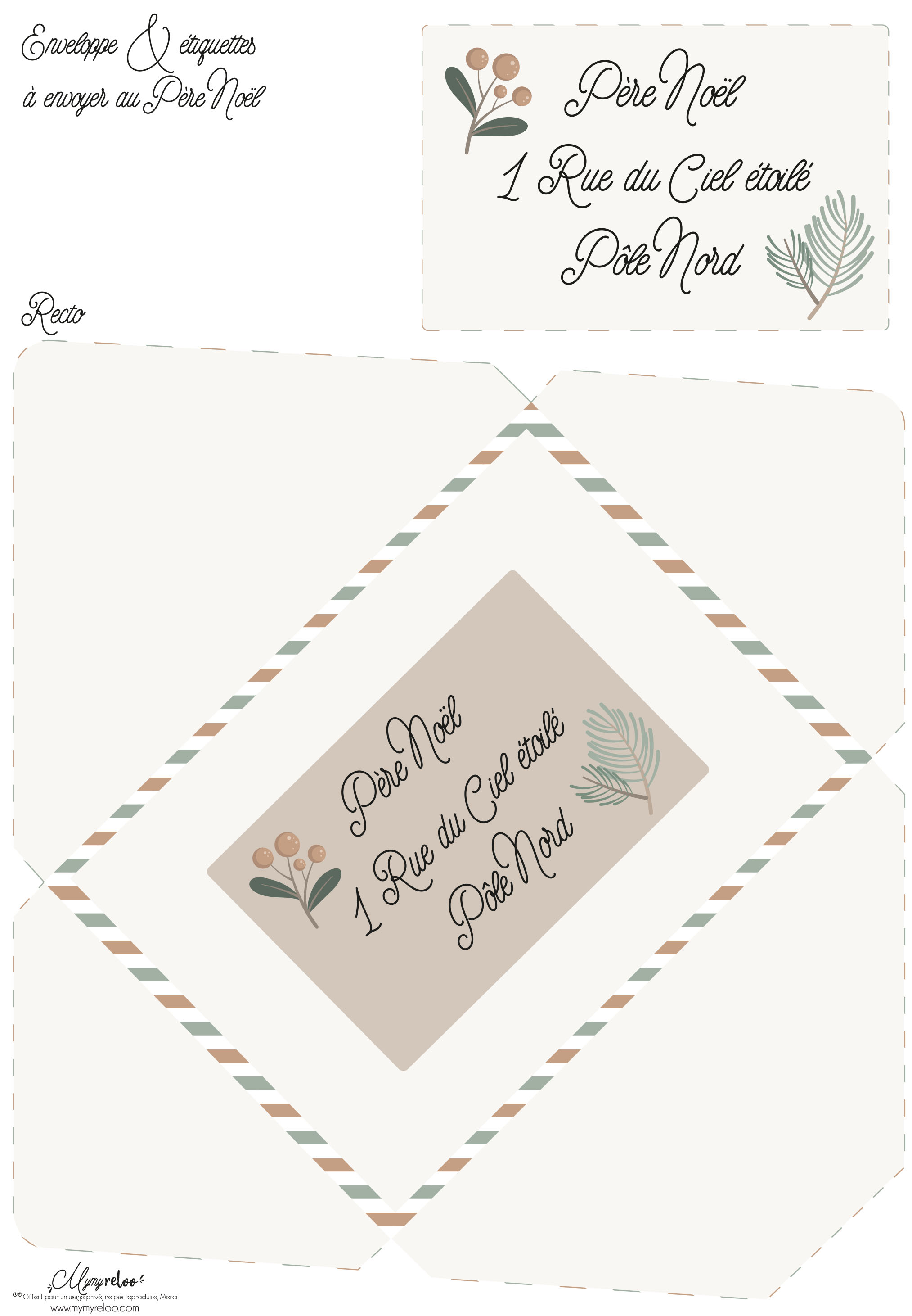J’ai ajouté cette année de quoi envoyer votre liste : un patron d’une enveloppe à faire vous-même, qu’il suffit de découper, plier et coller (ou juste à scotcher joliment pour la fermer). Même pas besoin de timbre et hop, votre liste au Père Noël file directement au Pôle Nord ! 😉