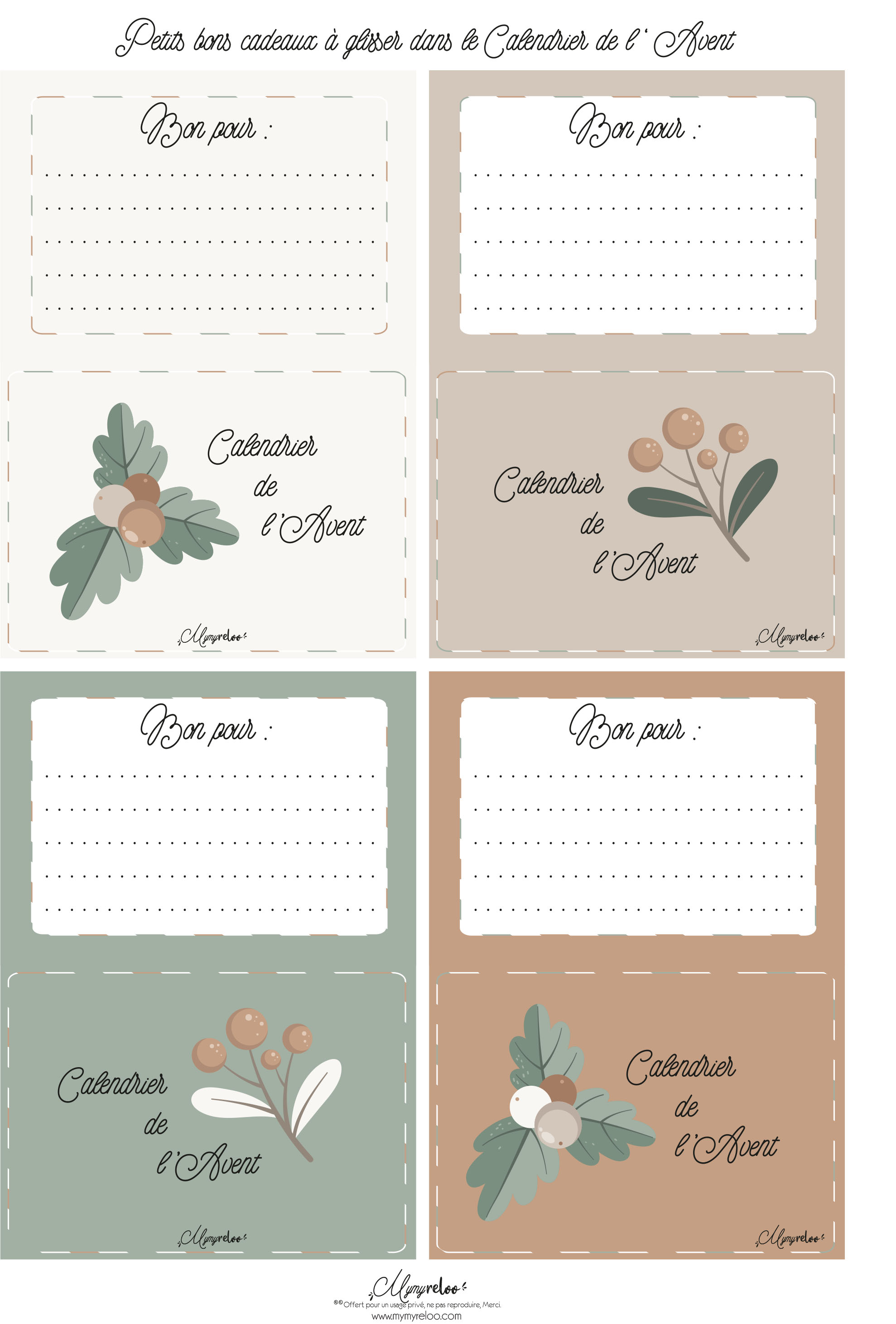 Et pour finir, je vous laisse également ici de quoi remplir votre calendrier de l’avent avec les « bons cadeaux » à imprimer.
