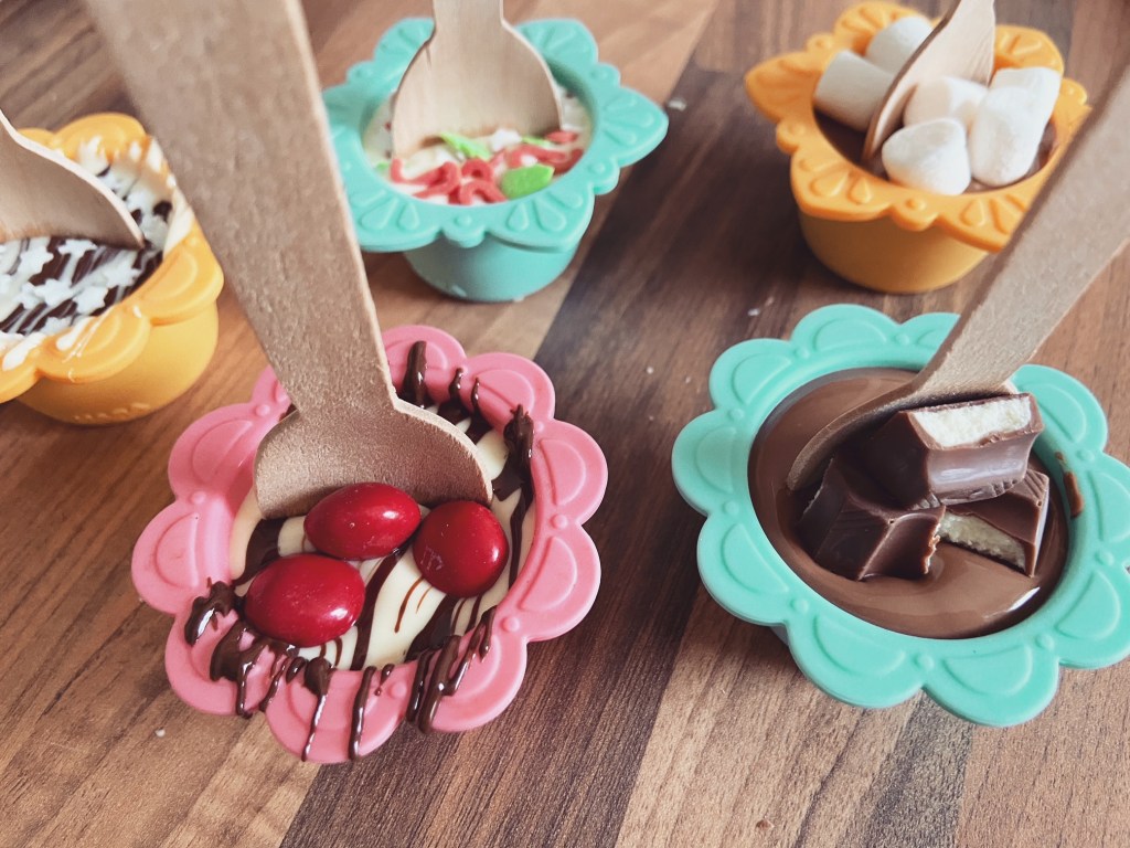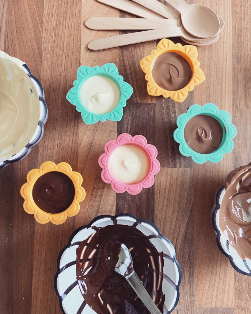 Dans un premier temps, faites chauffer au micro-onde vos carrés de chocolat à pâtisser pour qu’ils fondent. Remplissez vos moules aux 3/4. Attendez un peu pour que le chocolat soit moins chaud, puis placez votre cuillère & vos petites décos. Puis, mettez vos moules au frais pendant 1 heure environ.