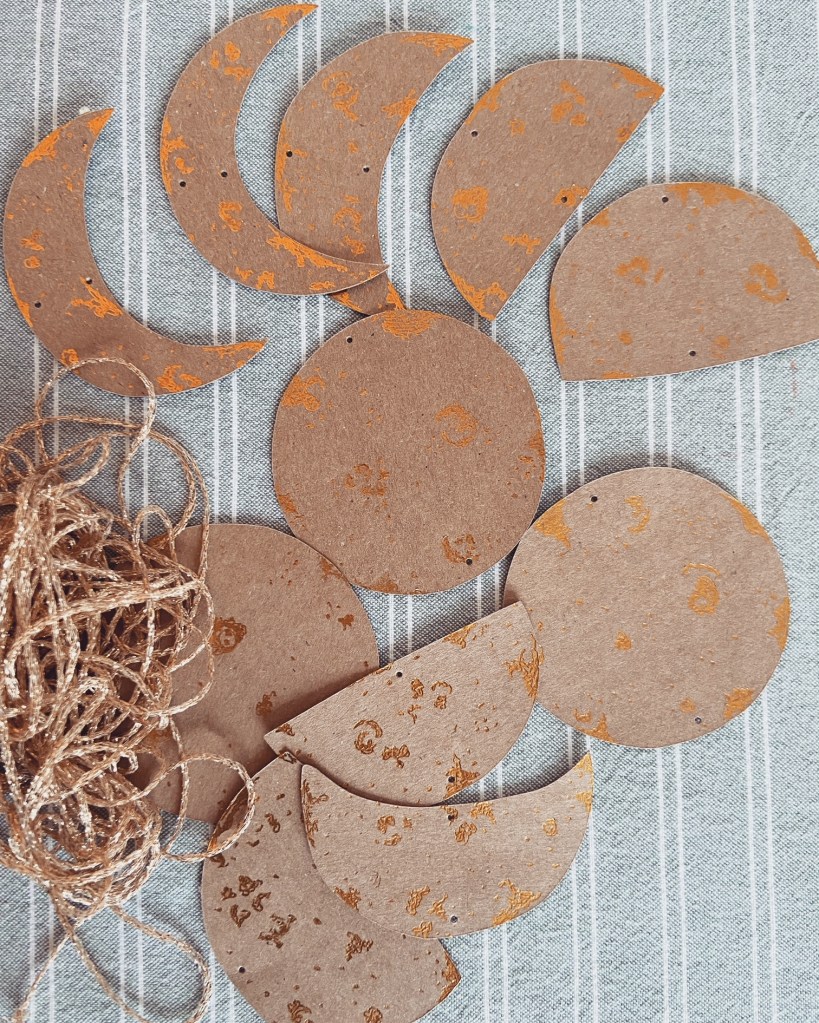 Pour commencer, récupérez le gabarit des phases de la Lune, en cliquant sur l’image ci-dessus. Imprimez sur le papier kraft & découpez au cutter ou aux ciseaux vos lunes.
