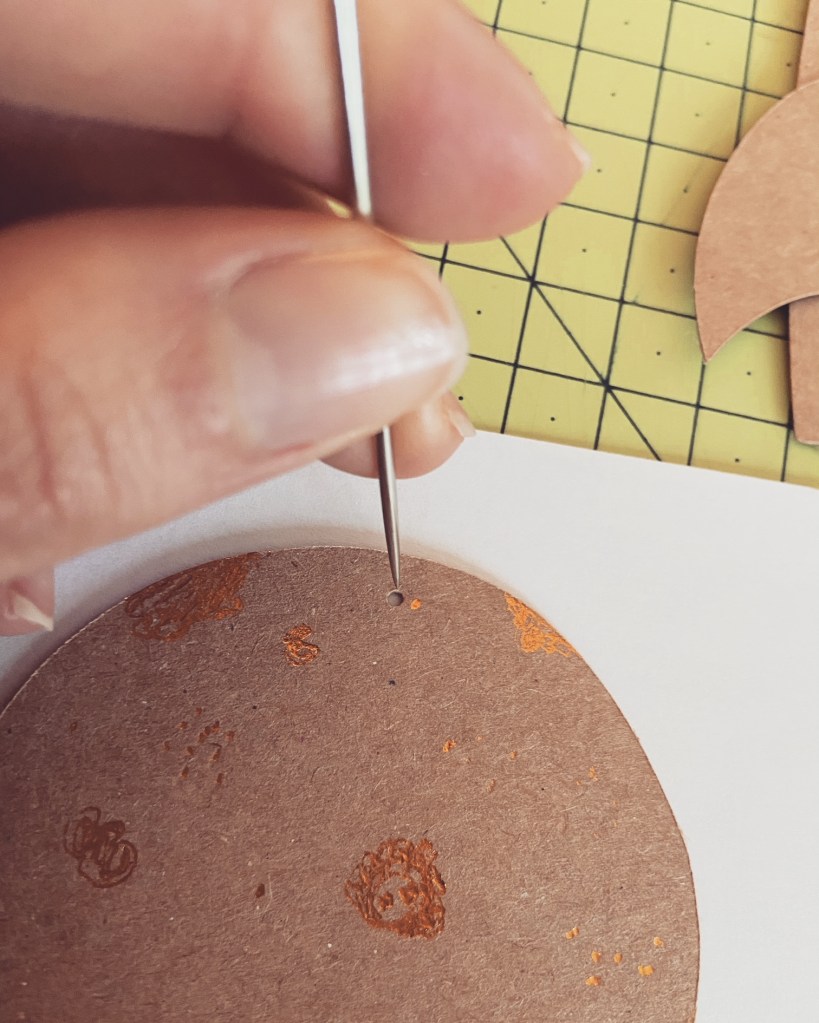 Ensuite, branchez votre stylet d’embossage et une fois chaud, appliquez un petit morceau d’aluminium doré. (Ou prenez votre crayon doré.) Dessinez des petits « cratères » de lune et des petits points, pour recréer la texture volcanique de la lune. Cette étape est à renouveler sur chaque phase.