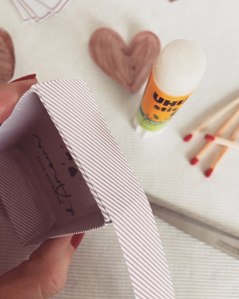 Ensuite, prenez le gabarit intérieur « Quelques mots d’amour » et pliez les 4 extrémités, puis placez-le dans la boîte. Rabattez le trop-plein de papier sur les extérieurs, toujours avec de la colle. Puis faites une bande de papier rayé, et collez tout autour de la boîte pour des finitions bien propre.