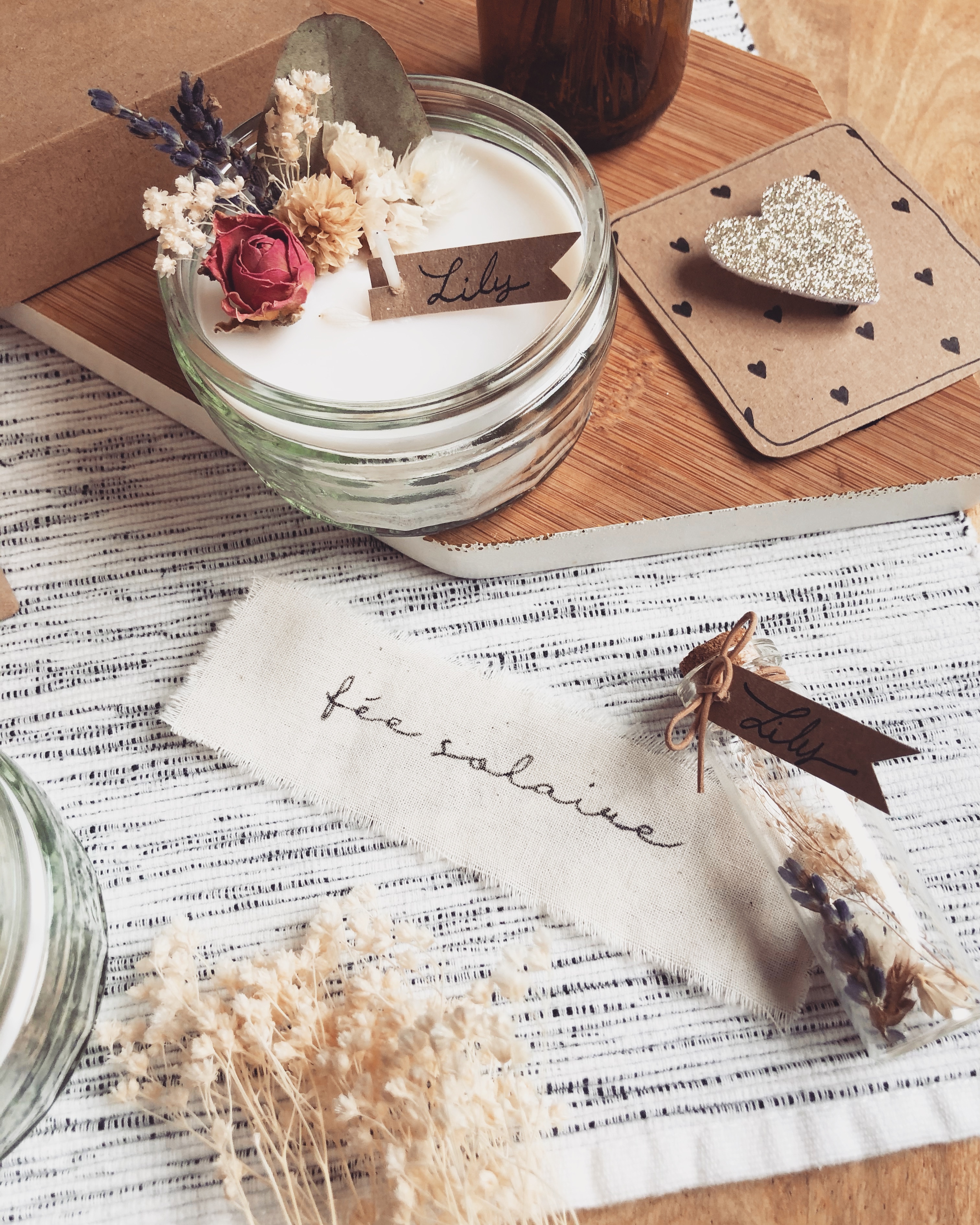 Pour la fiole, c’est simple aussi ! 🙂 Placez quelques bouts de fleurs séchées dans la fiole, découpez un petit morceau de tissu en écrivant un petit mot, roulez-le, fermez-le avec une petite cordelette et glissez-la das la fiole également. J’ai chois d’écrire « Fée douceur » et « Fée Solaire » pour mes 2 supers Marraines.