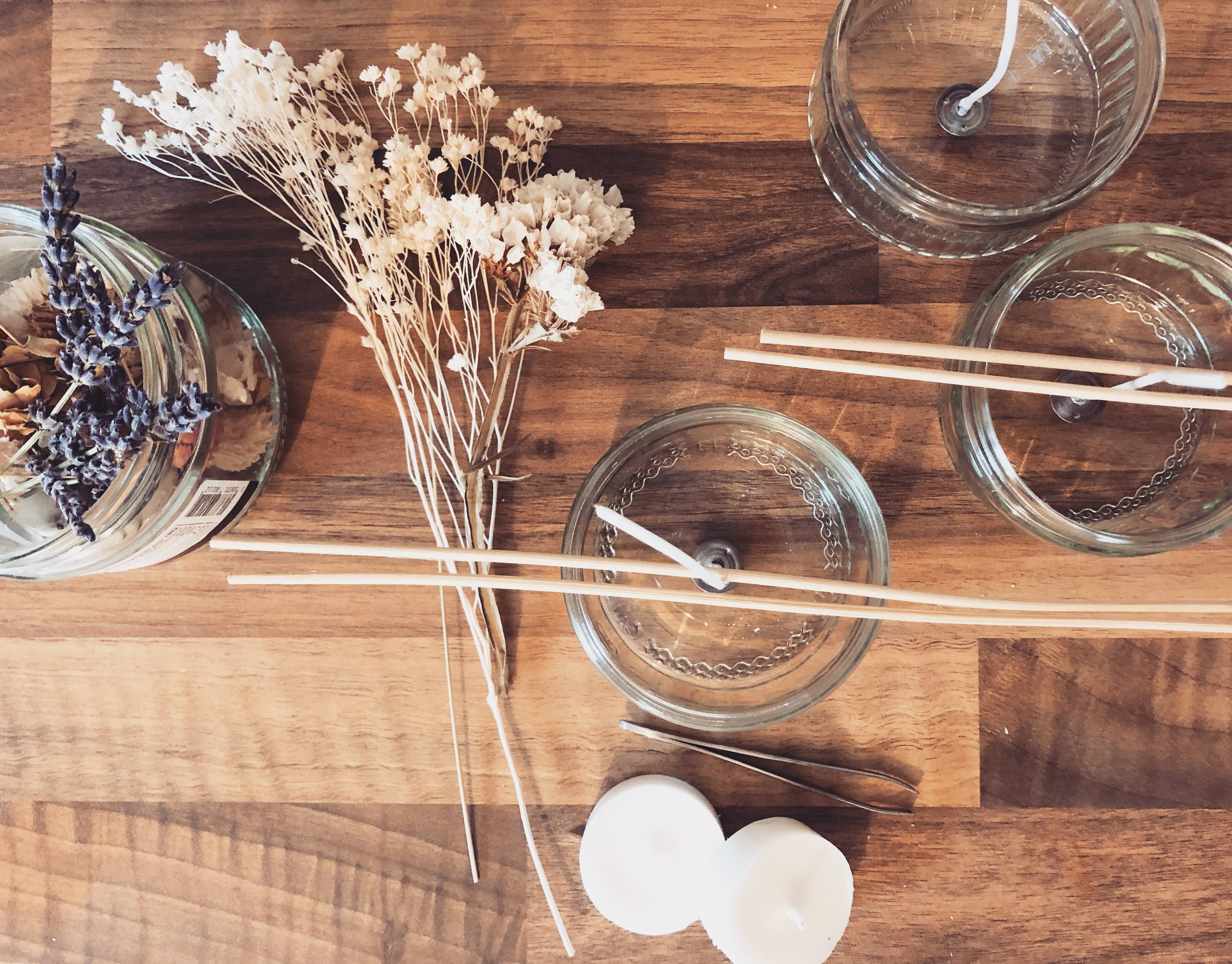 Lorsque le liquide est bien dilué, rajouté quelques gouttes d’extrait de senteur ou huile essentielle, puis versez-le dans vos pots en laissant 1.5cm environ entre la bougie et le bord du pot.