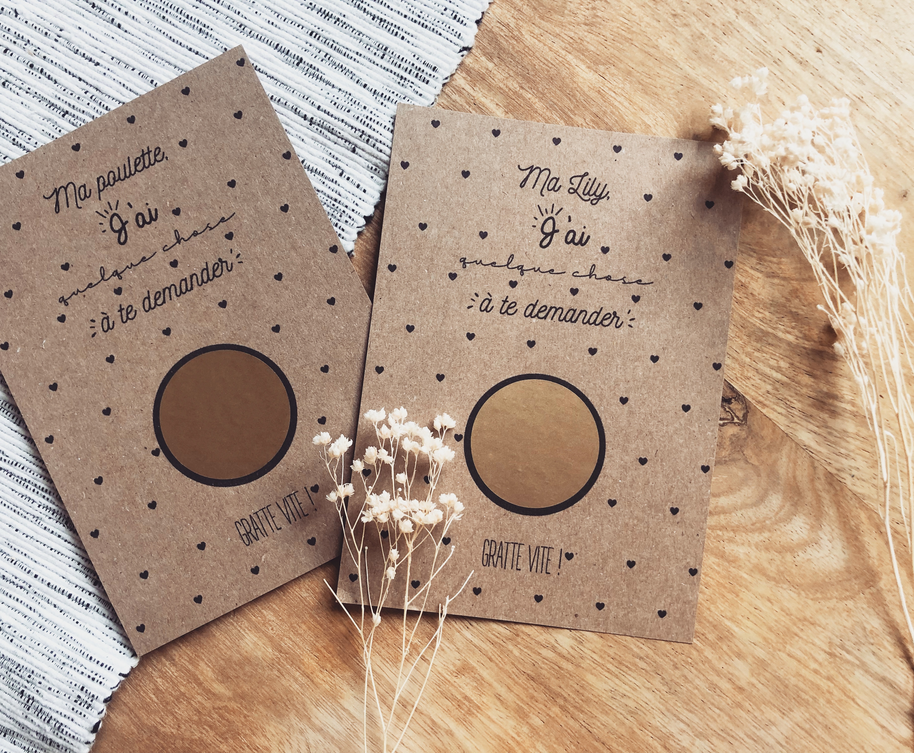 Pour la carte à gratter, j’ai fait appel à la Marraine de Myla, qui crée de la jolie papeterie ! Je lui ai donné les messages à écrire et elle m’a fait deux très belles carte à gratter, pour faire officiellement ma demande 🙂 Pour commander chez elle, c’est par ici : www.littlepopstudio.com.
