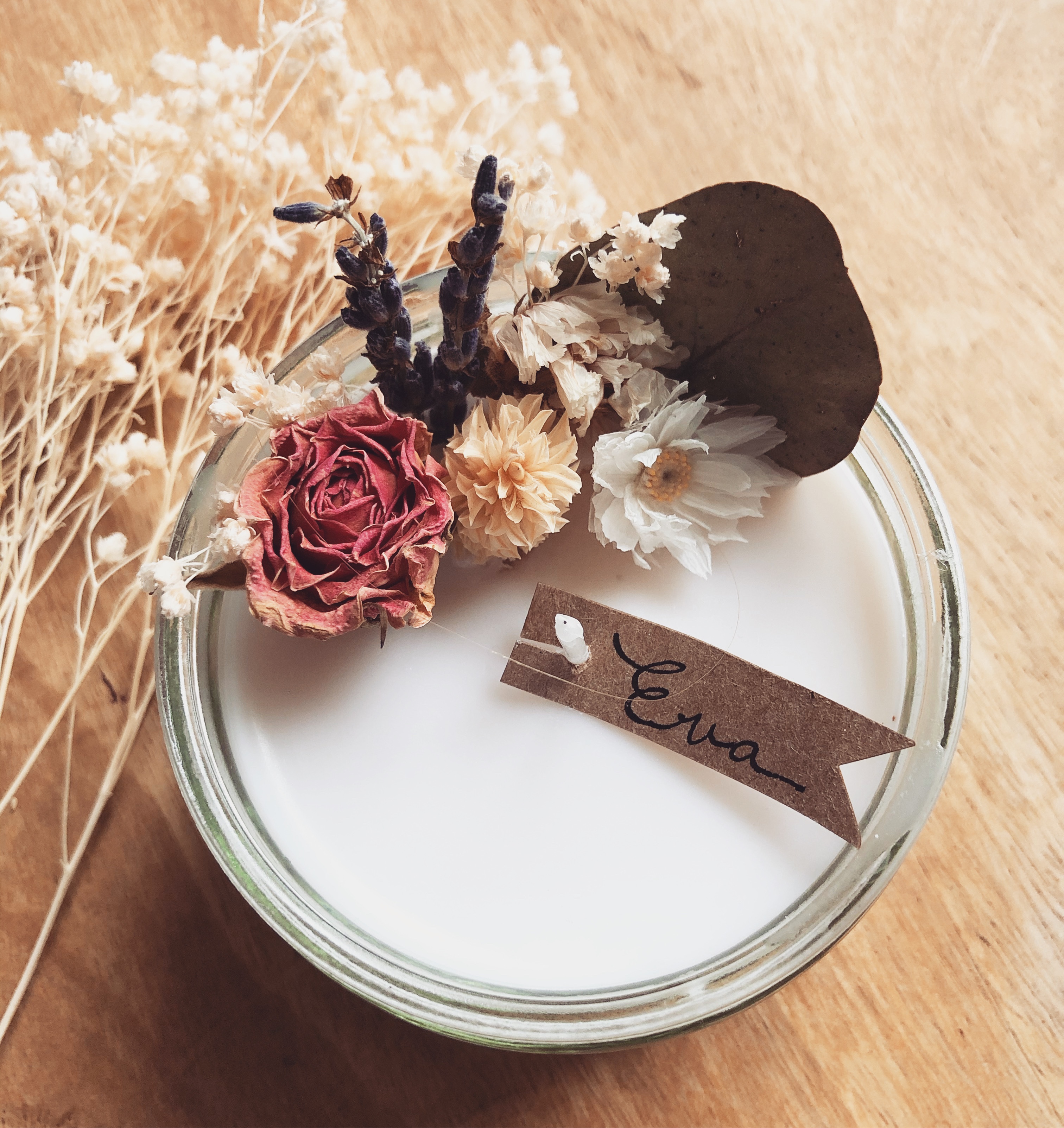 Une fois la bougie bien sèche, coupez la mèche environ 1.5/2 cm plus haute que la cire. Puis terminez avec un petit fanion en kraft au prénom de votre marraine à glisser au niveau de la mèche ! 🙂