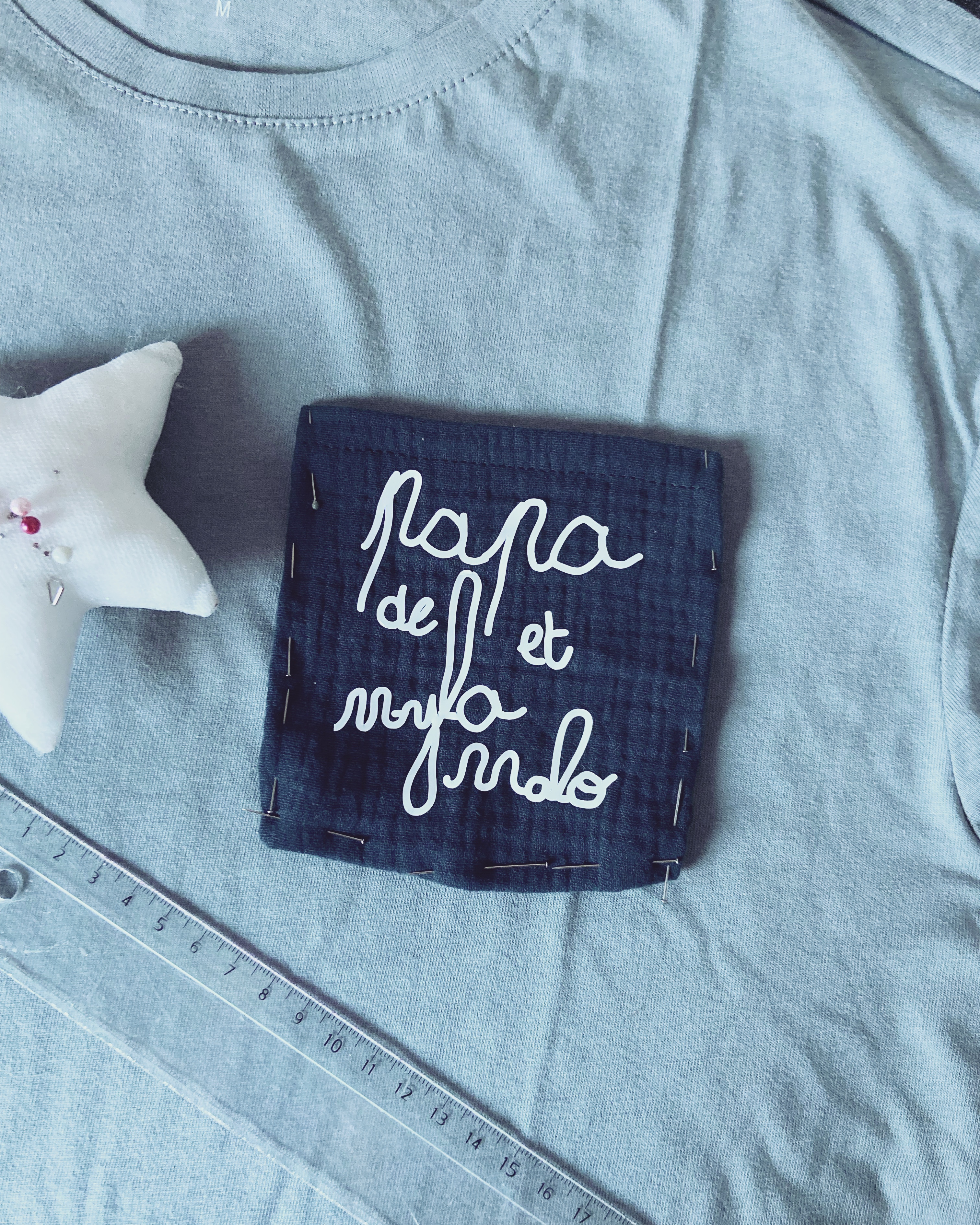 Ensuite, collez-le au milieu du carré de tissu (ici 12 cm par 13 cm) à l’aide d’un fer à repasser. Créez ensuite votre poche en la passant sous la machine : Pour cela, il suffit de faire un ourlet sur le haut de la poche et un rebord de 0.5 cm à 1 cm max tout autour. Une fois votre poche montée, plaquez-la sur votre t-shirt, au niveau de la poitrine, à la machine à coudre ou à la main.