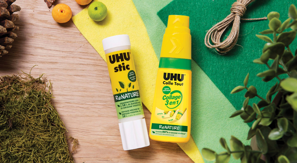 La marque UHU, que nous connaissons tous, s’engage depuis plusieurs années à produire des produits durables, autant à travers leurs contenus que dans leurs contenants. La gamme ReNature, utilisée ici en stick et en 3 en 1 liquide, est la première glue au monde conditionnée dans un contenant fabriqué à partir de matières premières d’origine végétale. En effet, le tube est constitué à 88 % de bioplastique recyclable extrait de la canne à sucre (on remarque le changement avec une nouvelle couleur de tube, qui n’est plus blanc opaque, mais légèrement coloré et transparent!). Et pour ce qui est de la colle elle-même, ils ont privilégié à 98 % les ingrédients naturels (dont l’eau).