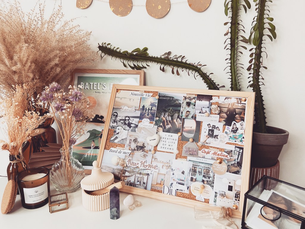 Une fois votre visionboard terminé, installez-le dans un endroit où vous êtes sûr de le voir chaque jour, et prenez le temps de vous arrêter devant pour vous en inspirer avant chaque début de journée ! Vous pouvez le poser sur un meuble avec d’autres photos, de la déco que vous aimez, une bougie, des cristaux, un peu comme un hôtel pour qu’il prenne de l’importance et que cela vibre en vous !