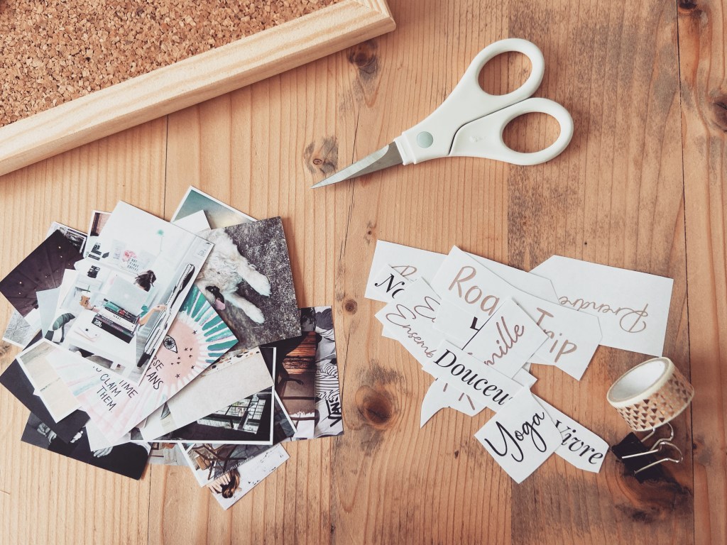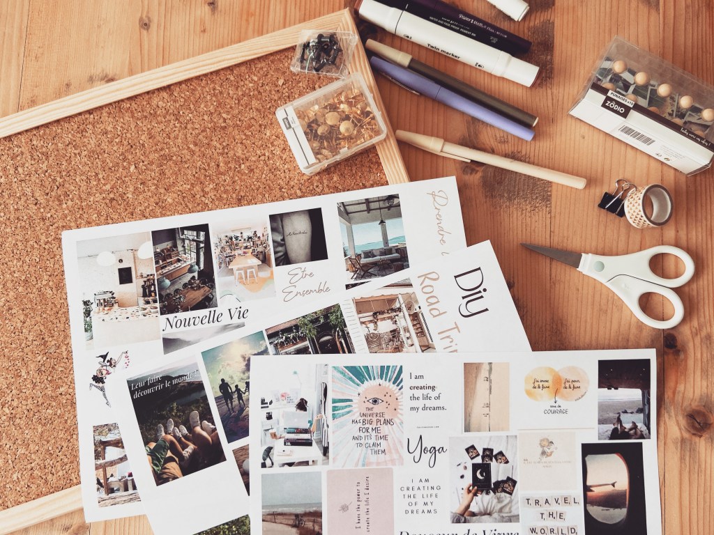 Pour cela, je vous propose de créer un Vision Board. Un Visionboard, c’est un tableau de visualisation, un peu comme un moodboard de tendance, en collant des images et des mots sur un support pour mieux visualiser vos projets.