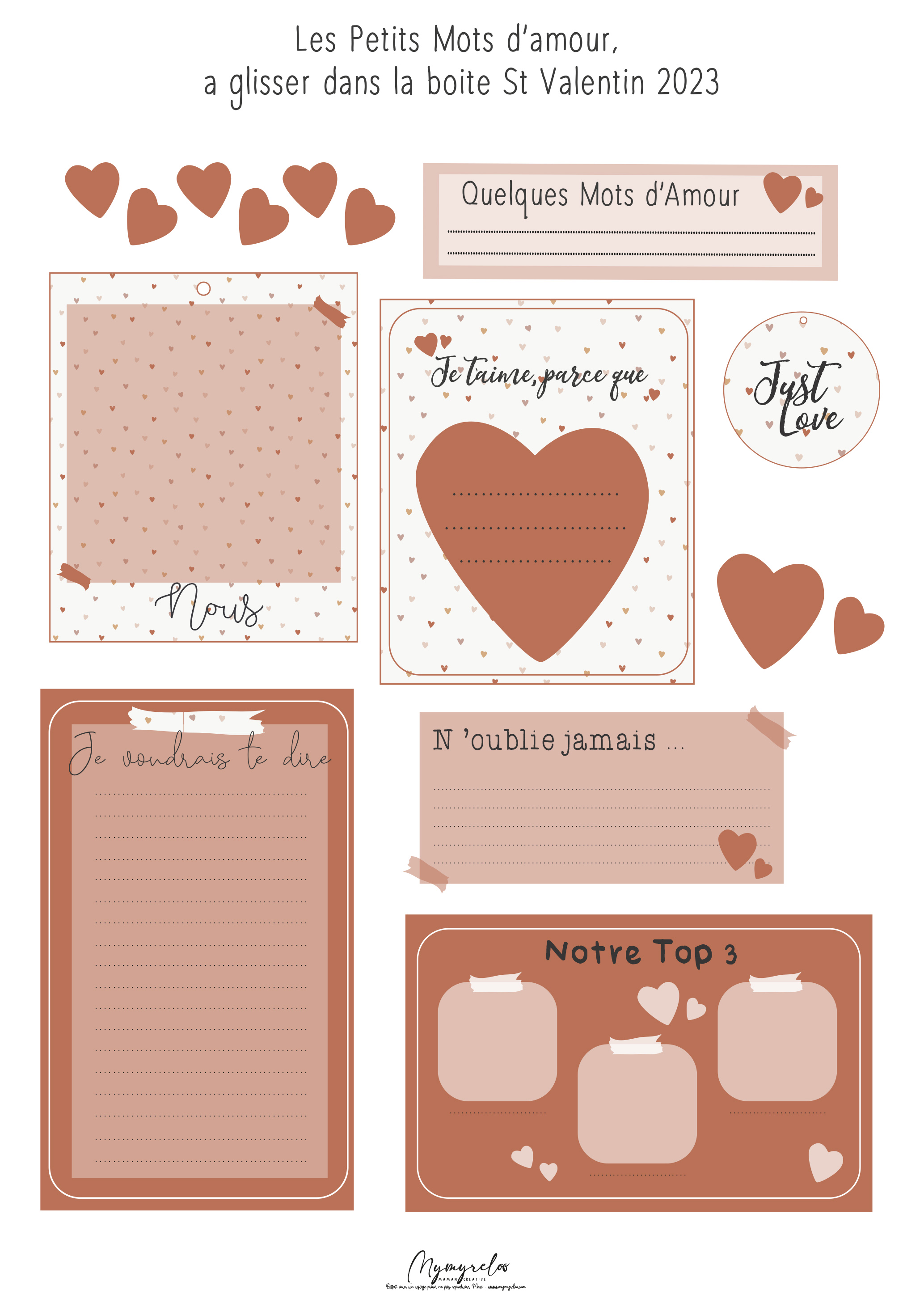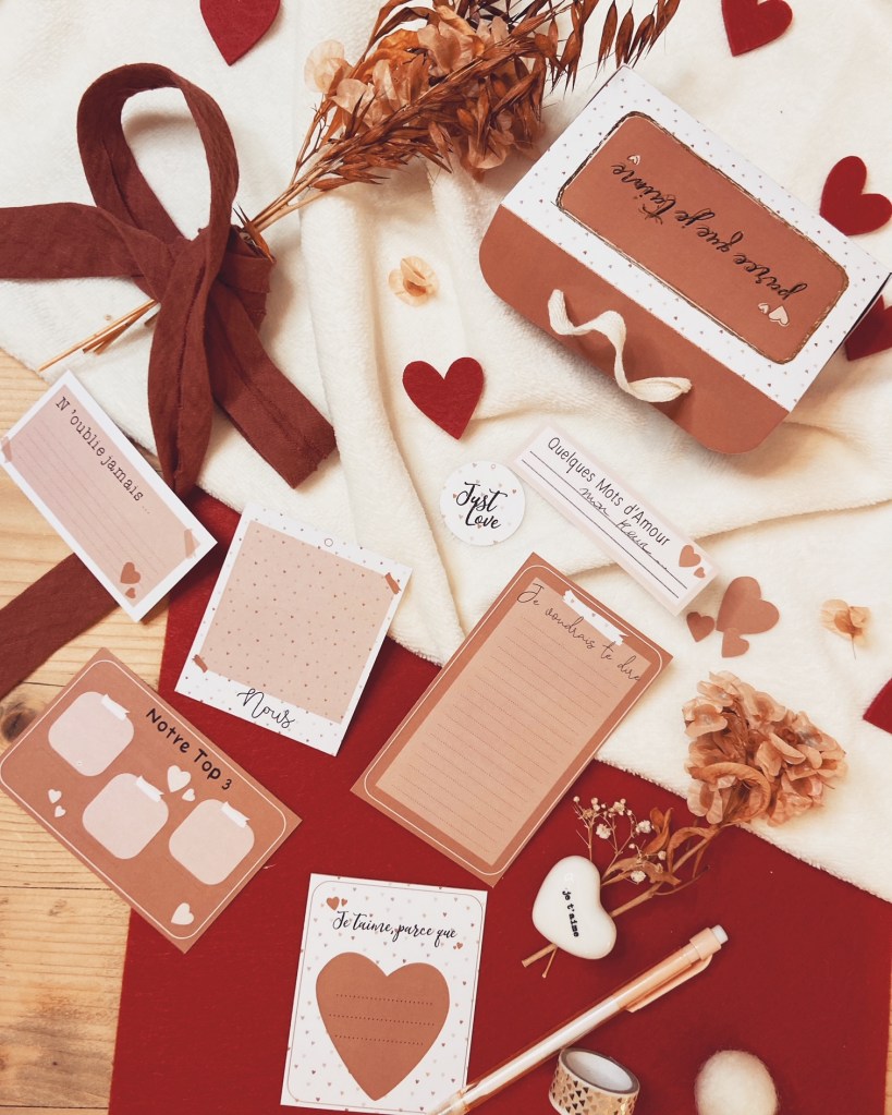 Si vous le souhaitez, vous pouvez aussi imprimer la planche « Des petits mots à glisser » (voir en haut du tuto!). Découpez ceux qui vous plaisent, remplissez-les (mots d’amour, photos, anecdotes etc…) et mettez-les dans votre boîte.