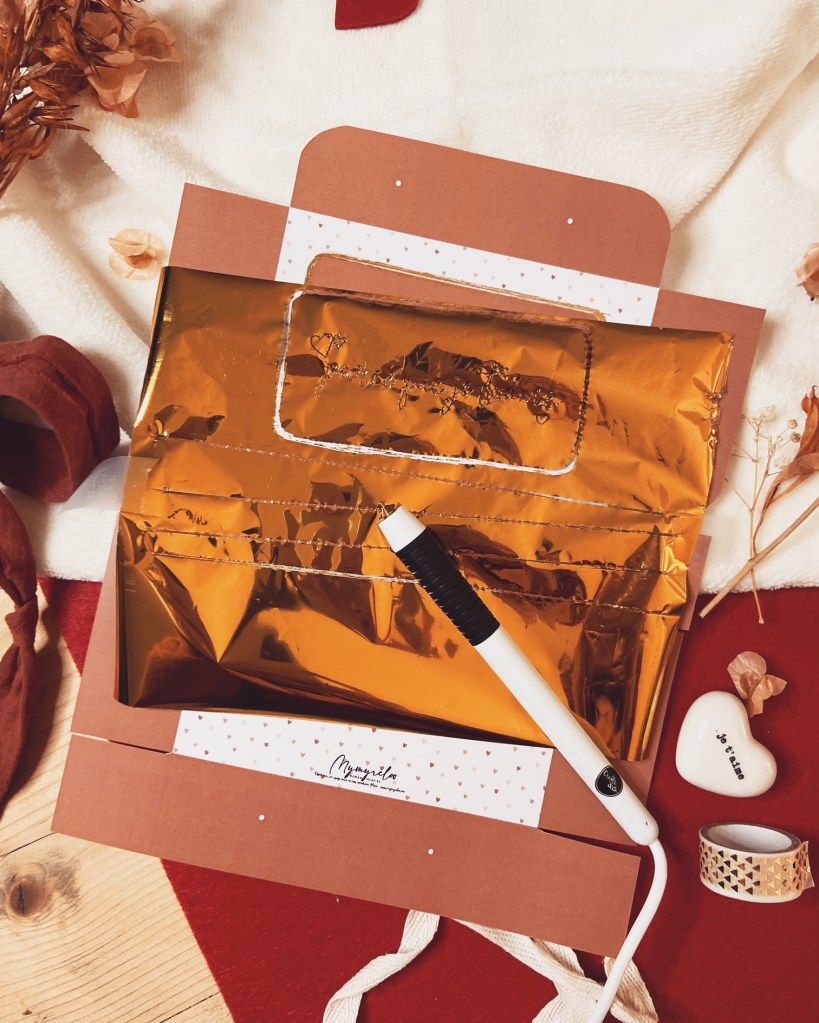 Ensuite, j’ai voulu rajouter un peu de foil doré, donc soit à la main avec un feutre, soit avec un pistolet spécial Foil, soit à la Cricut. Faites-le pendant que votre boîte est encore à plat, dans tous les cas. Cette étape reste facultative !