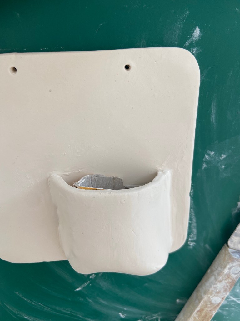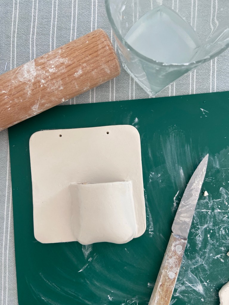 Refaites les 1ères étapes pour créer la « poche » qui accueillera les fleurs. Pour cela, faites une bande d’argile et placez un petit bout de carton à la place de la poche pour aider à créer son volume. Pour « coller » la poche, passez un peu d’eau et en cas de « vide » rajoutez un peu de matière.