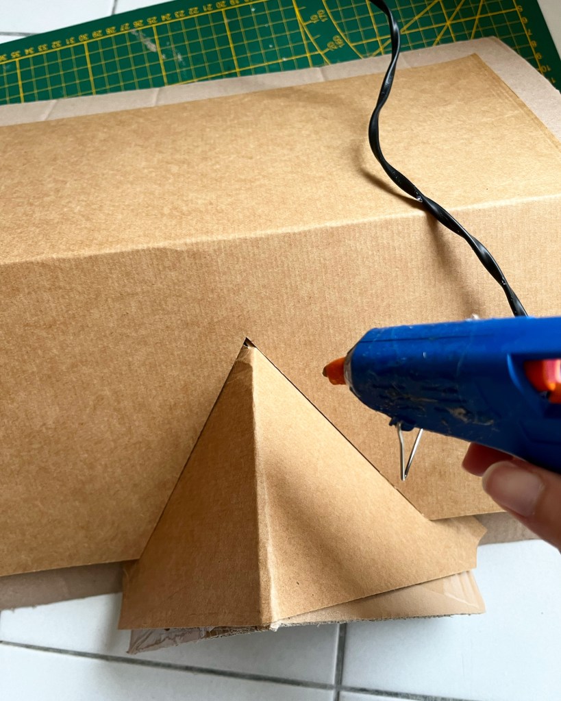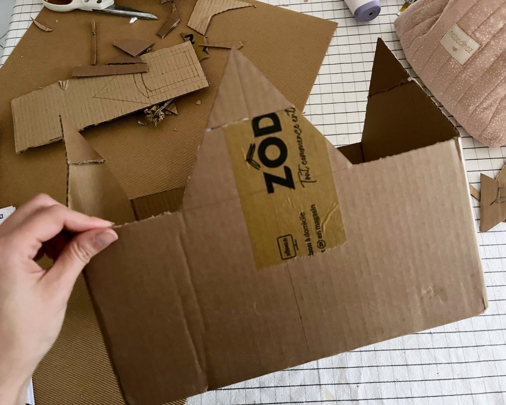 Voilà votre base en carton est prête ! Ce n’est pas forcément beau, mais ce n’est pas grave, nous allons camoufler toussa en recouvrant le tout avec du papier kraft. Pour cela, reportez vos formes sur le kraft, découpez et collez le kraft sur le carton.