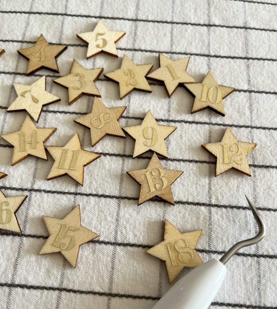 Pour terminer, choisissez la solution que vous souhaitez pour customiser vos étoiles. Ici, j’ai utilisé du vinyle doré avec ma Cricut. Pour accrocher vos étoiles, il suffira d’un petit bout de Patafix !