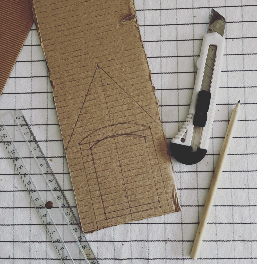 Ensuite, il vous faudra créer votre entrée en relief. Pour cela, prenez du carton, reportez la forme « Entrée » sur votre carton en adaptant vos mesures et découpez-la en retirant la porte. Pour l’épaisseur des « murs » sur cette partie, faites des bandes de carton de 3cm et collez-les tout autour de votre forme.