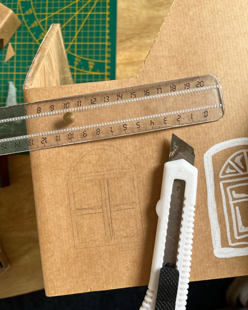 Avec l’aide d’un cutter, vous pouvez créer des ouvertures pour vos fenêtres. Ensuite, décorez vos 4 faces de maison, l’entrée, le toit & la cheminée avec un feutre craie. Pour vous aider, voici quelques zooms du chalet :