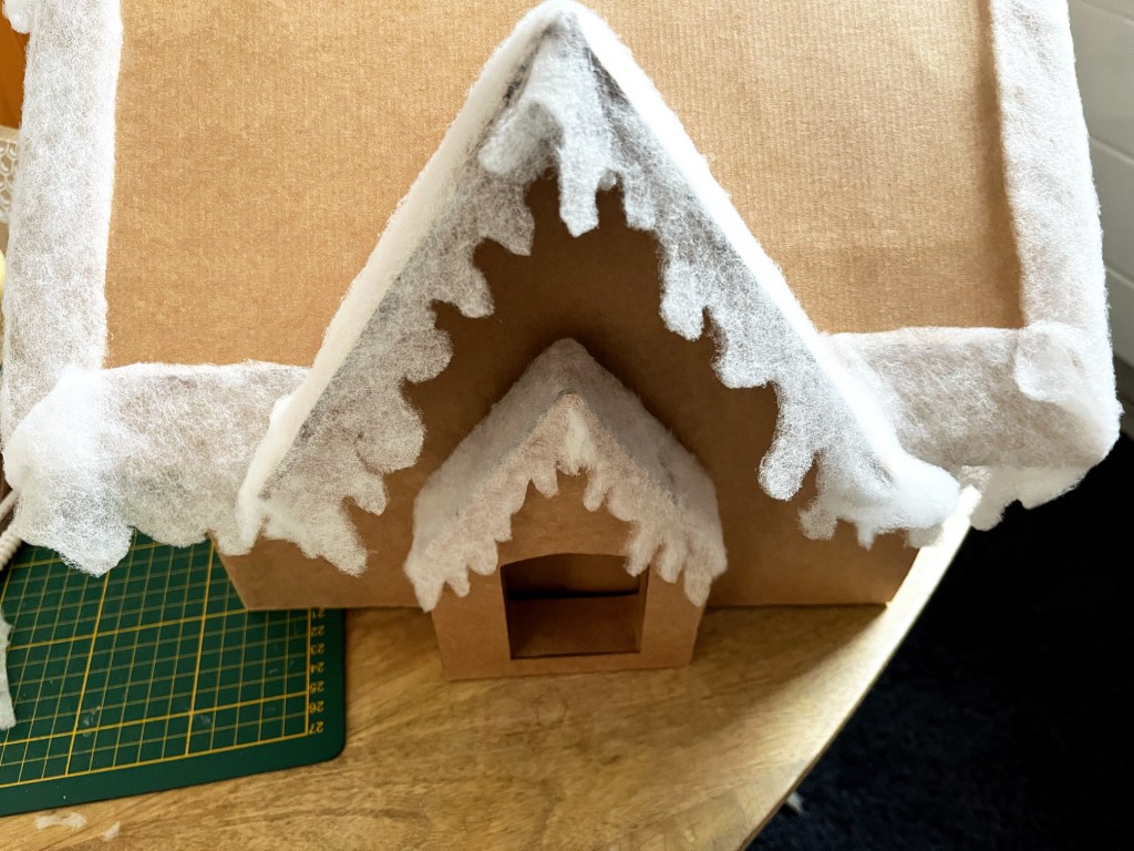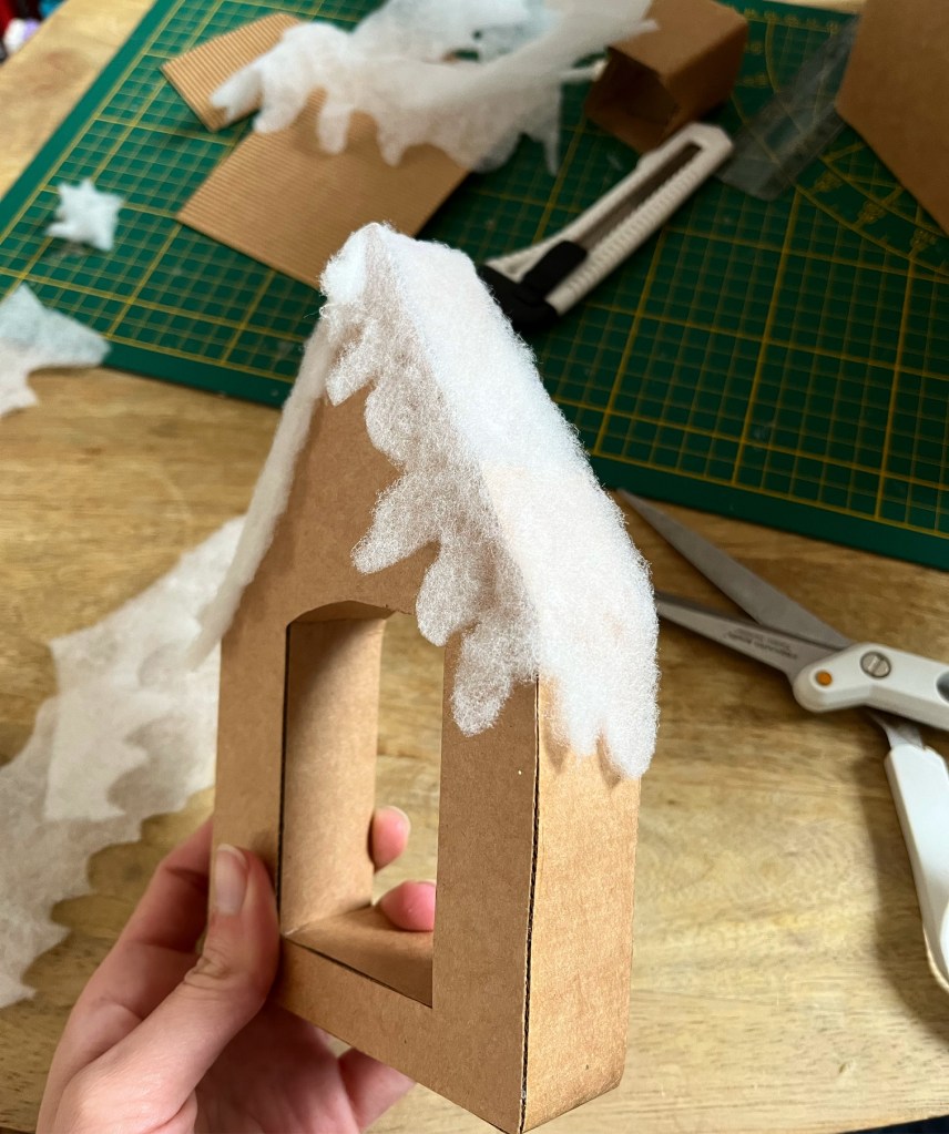 Votre chalet de base est prêt. Maintenant, passons à la déco : On pose une bande de ouate de 8/9cm de large tout le long du toit, idem sur le toit de l’entrée et en haut de la cheminée, avec une largeur de 5cm environ. Ensuite, avec un petit ciseau, découpez votre ouate comme si c’était de la neige qui tombait du toit.